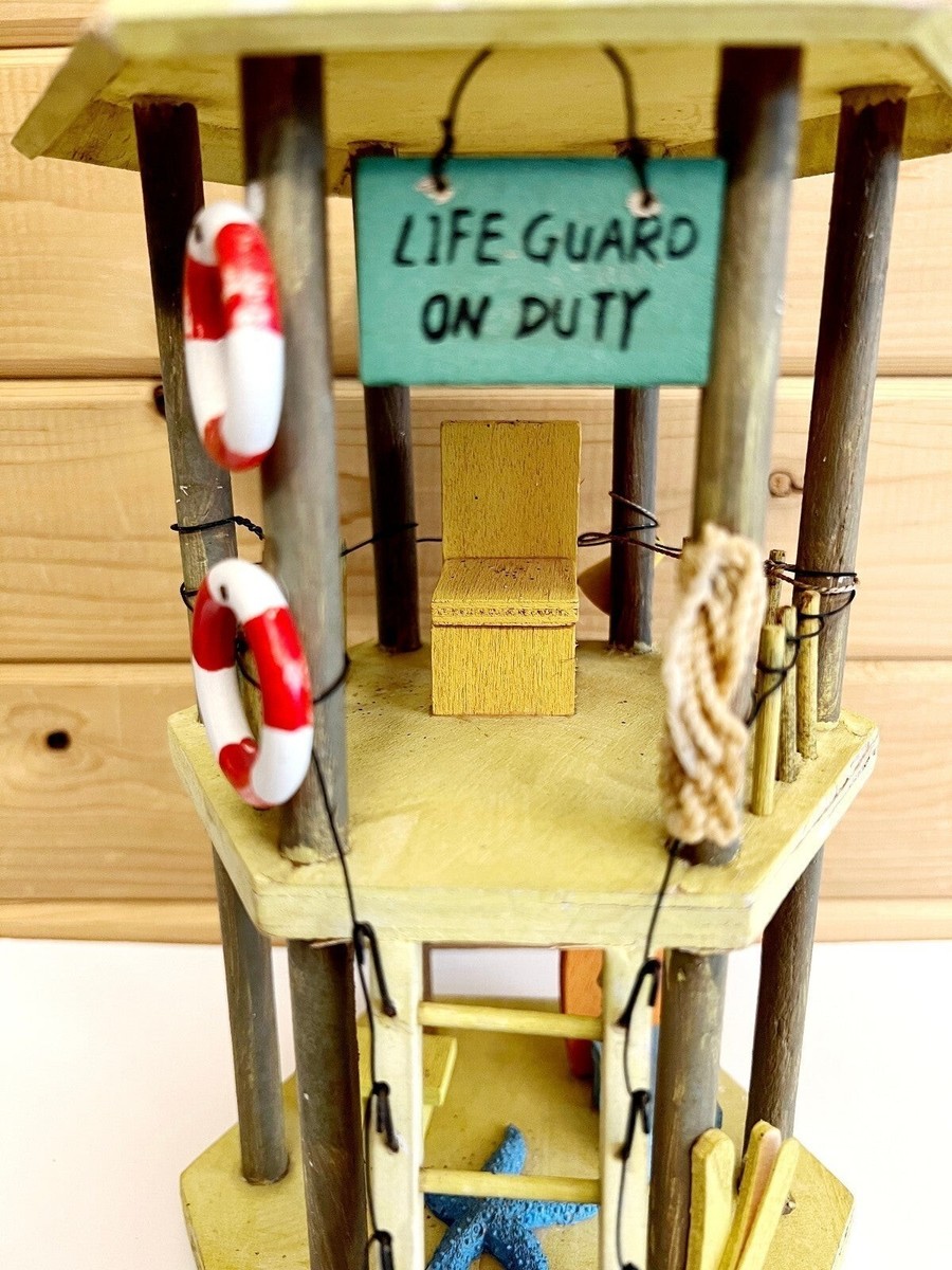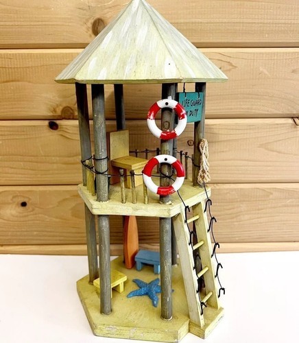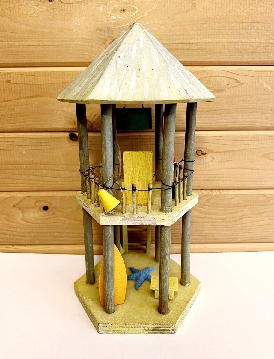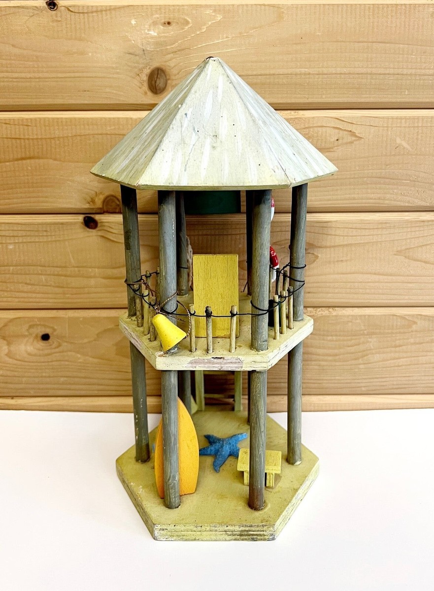 Vintage Nautical Wood Life Guard Hut Handmade 1970 Maine Coast Decoration 12" Has wear....paint flakes, dust (surfaces are rough and cleaning leaves fuzzies) and staining/fading. This would look awesome in cabins, cottages, bathrooms, air bnb, lakeside or ocean rooms....great nautical coastal Vibes. Handmade in Maine. Approx 12 inches tall, 6 inches wide at the widest part. Small metal Hook loop on top is dented in but could easily be fixed/replaced for ceiling hanging. Free standing as well. Tons more toys, collectibles, paper, antique, vintage ephemera, maps, engravings, prints, vinyl, vhs, media, books! Will combine shipping! Auc