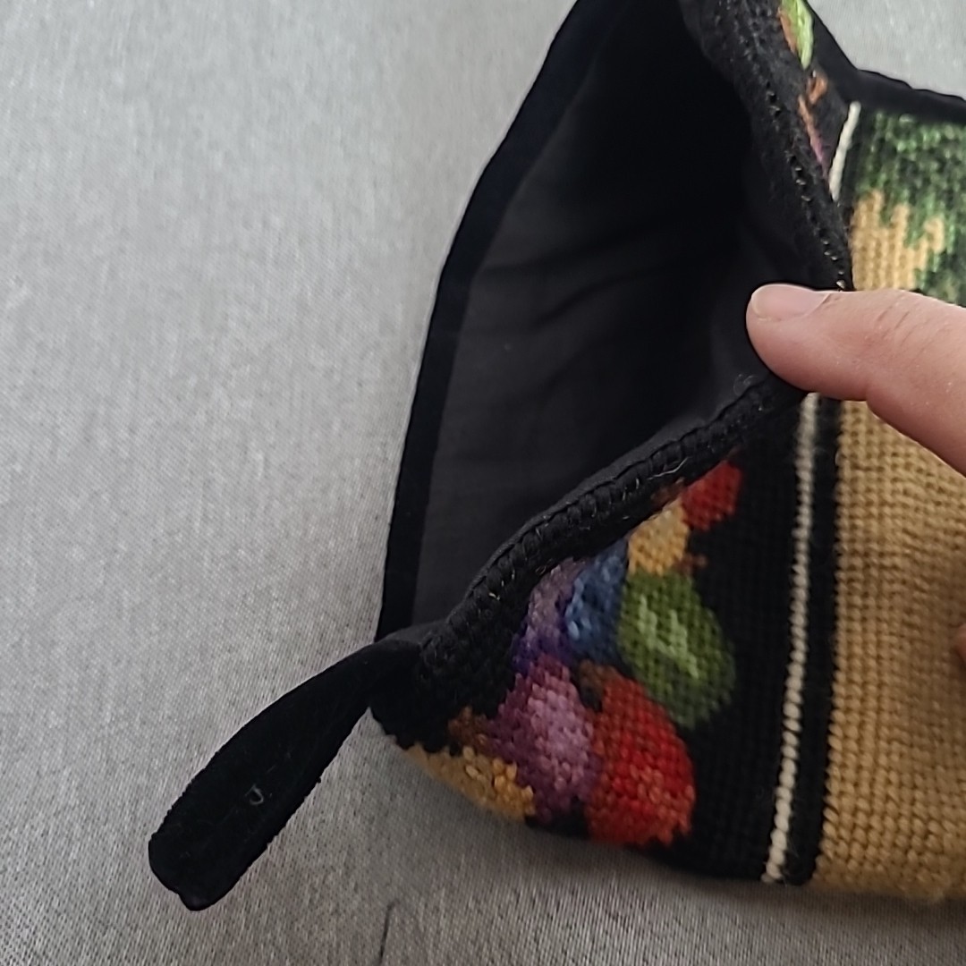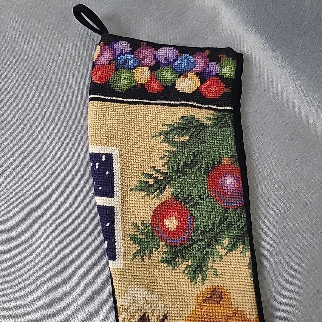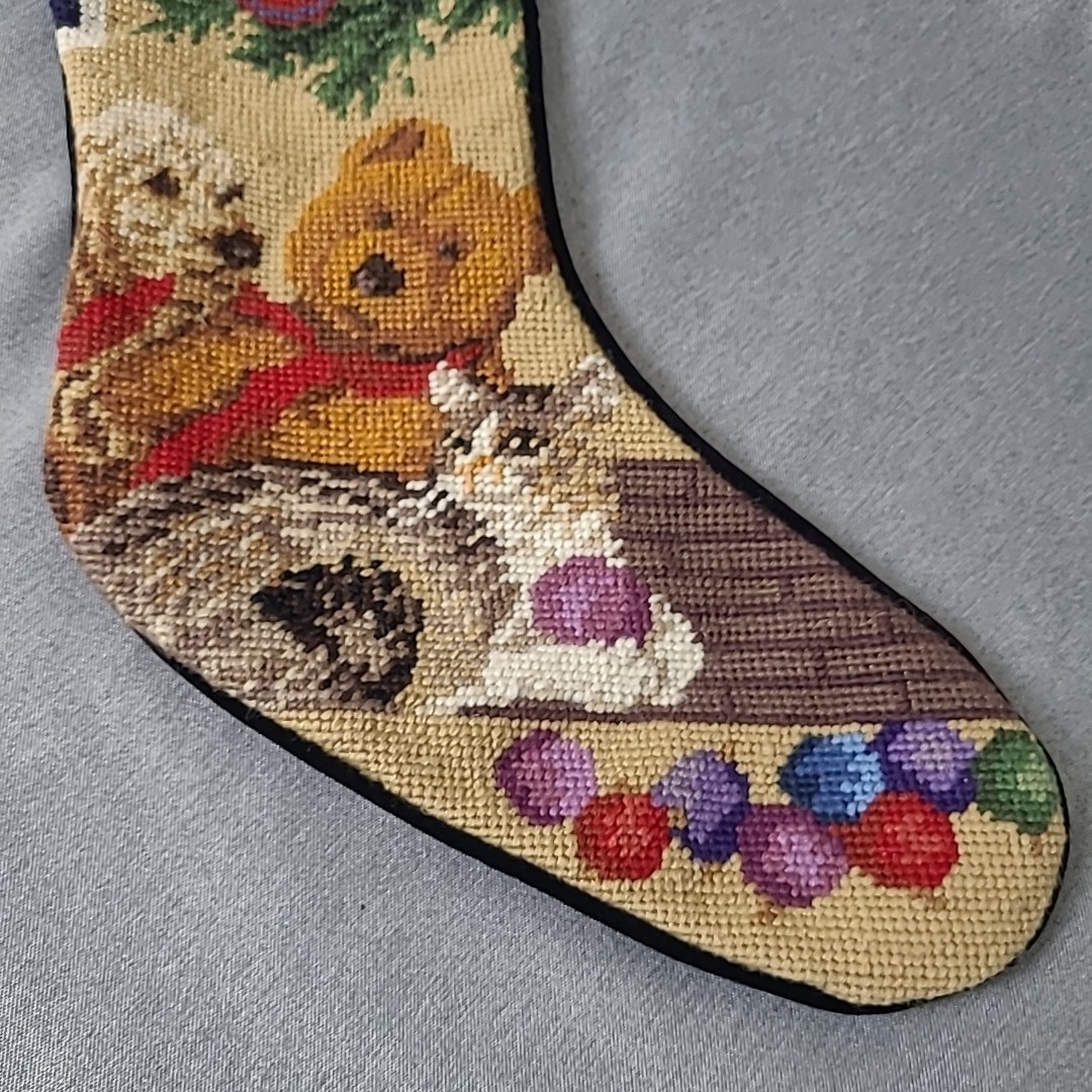 Vintage Needlepoint Christmas Tree Stocking Velvet Back Wool Teddy Bear Cat Dog Excellent condition