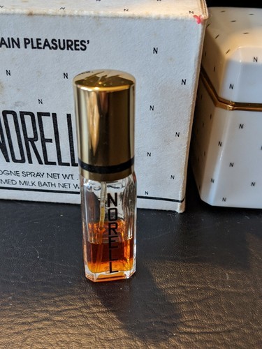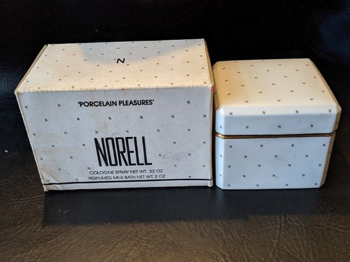 A vendre est une nouvelle boîte de plaisirs en porcelaine Norell vintage avec: .32 Oz Spray Cologne Bath de lait a parfum de 2 oz Cuillere La boîte a une usure d'etagere et des taches de s'asseoir.