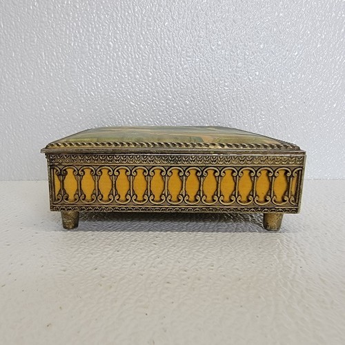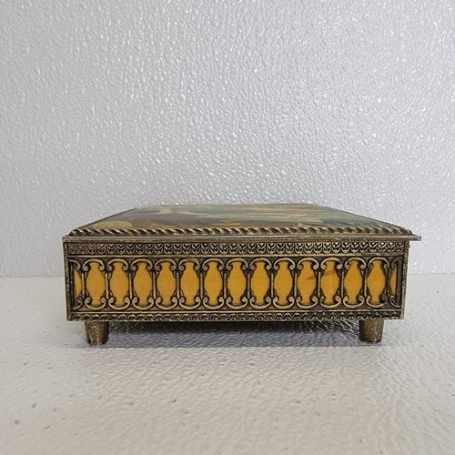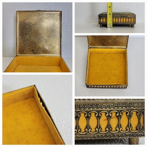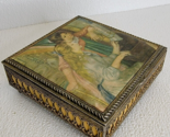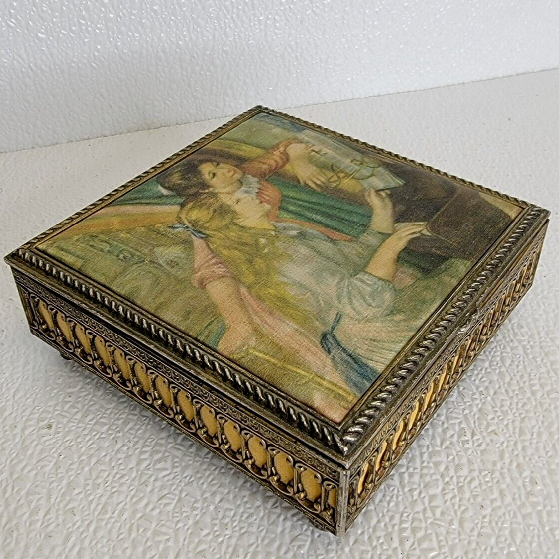 - Vintage Ornate Metal Trinket Jewelry Square Box Girls at Piano Satin Lid Japan