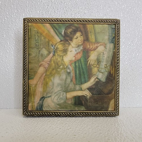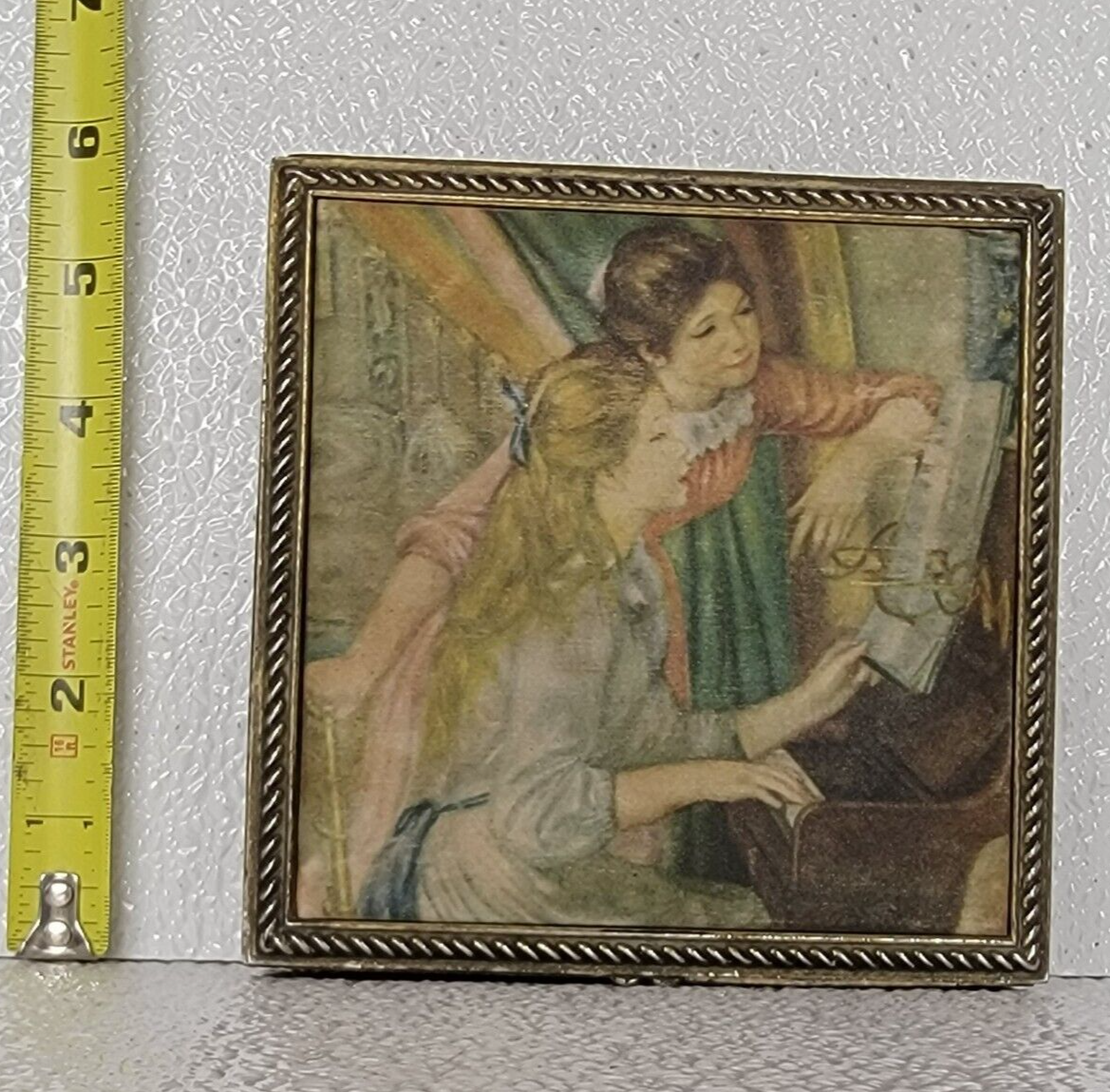 Vintage Ornate Metal (Brass? Kind of heavy) Trinket Jewelry Square Box "Two Young Girls at The Piano by Pierre Auguste Renoir" Satin Lid Velvety Yellow Lining Made in Japan. Some wear spots as seen in images. Images show actual box that will ship.