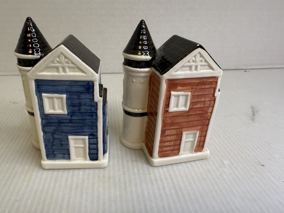 Vintage Otagari Japan ceramic blue and red hand painted Victorian houses salt and pepper shaker set. Perfect gift. Each measures approximately 4? x 2.5.? Both have stoppers. In excellent vintage condition. No chips or cracks. Some minor wear on base. Please review all photos carefully as they are part of the description.
