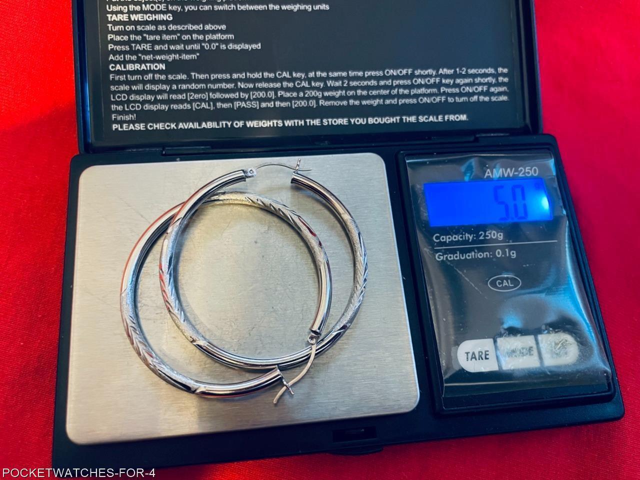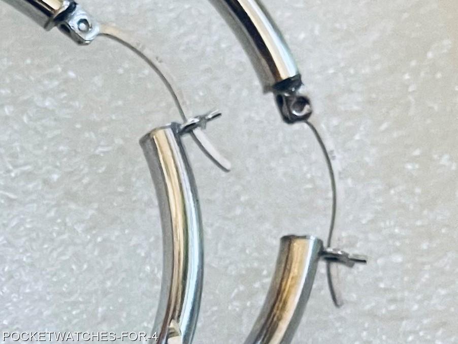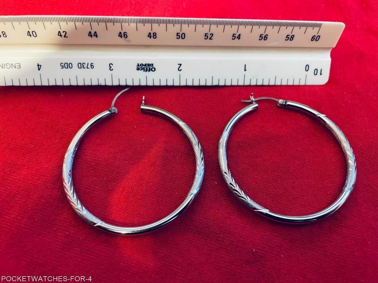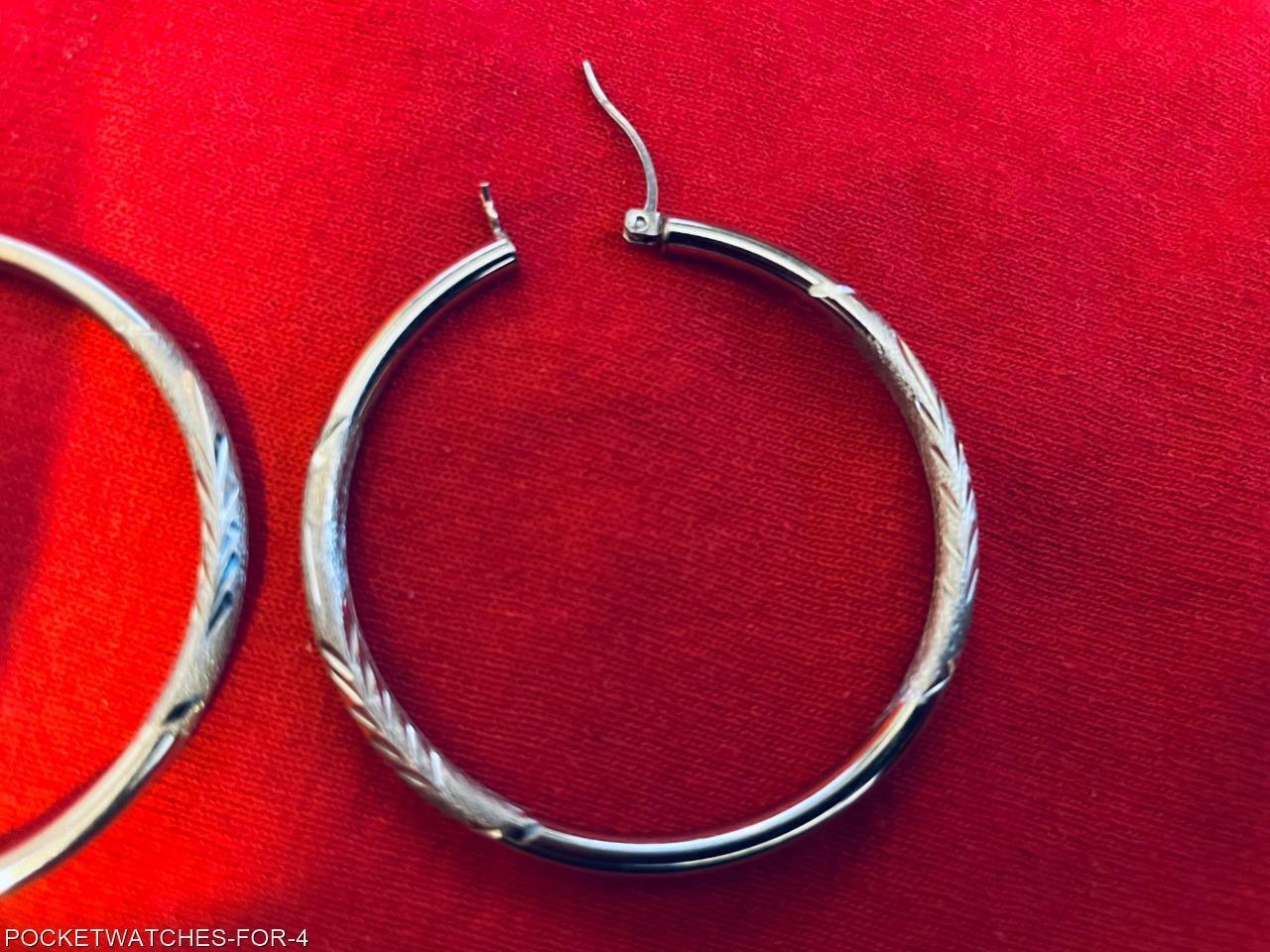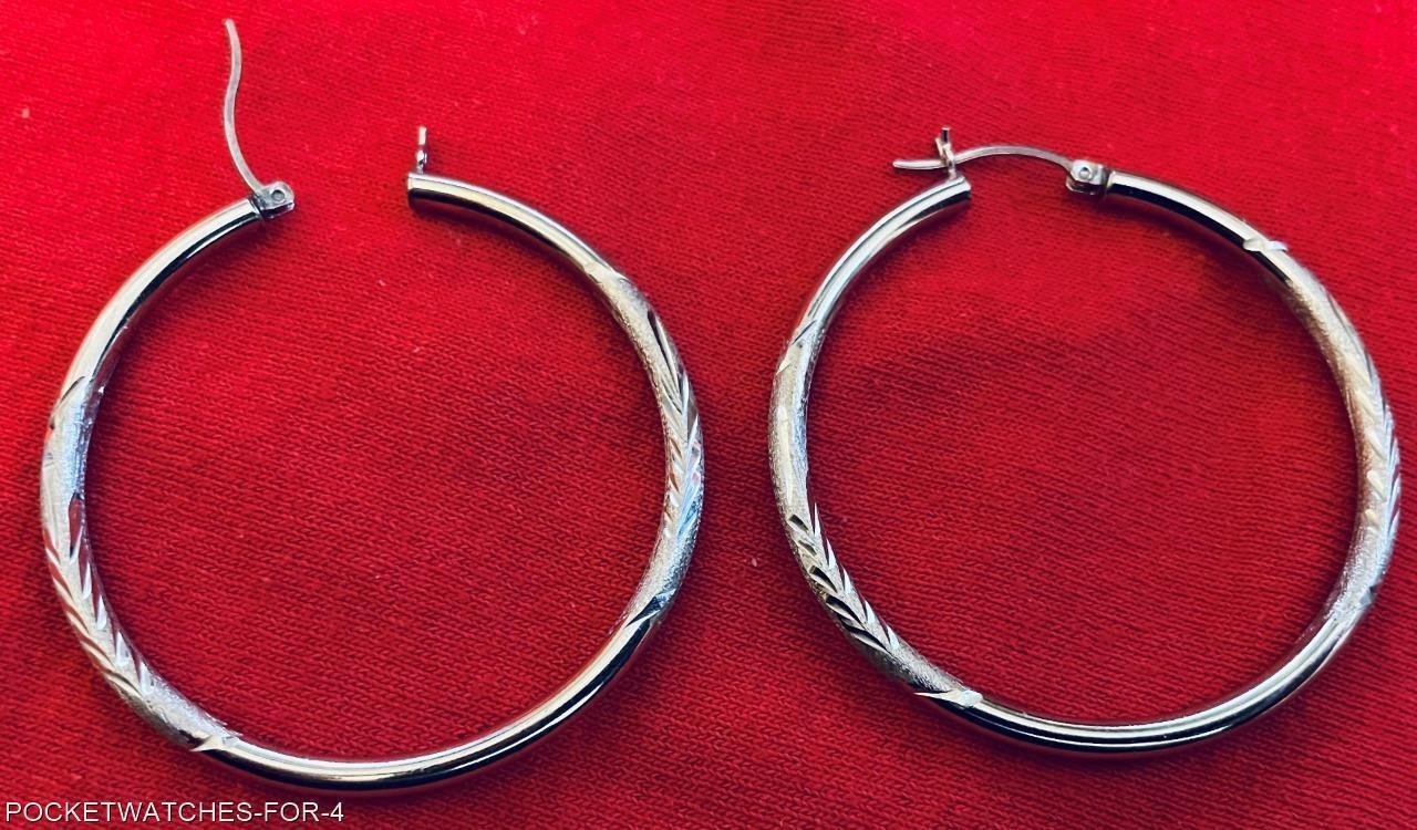 This is a pair of vintage 14kt white gold hoop earrings. Each post closure has an 88 and 14k hallmark (NOTE: We used a 60x Magnifying loop to read the Hallmark)