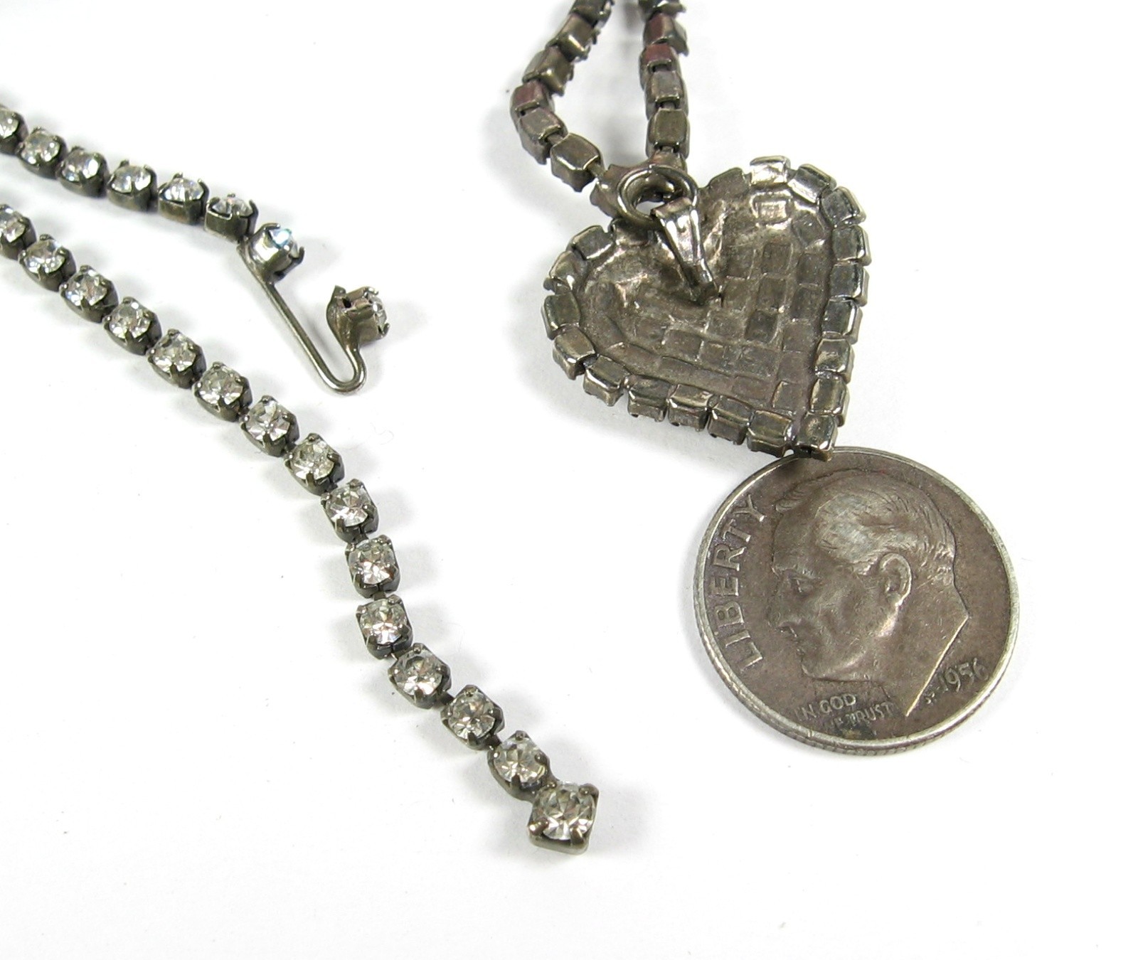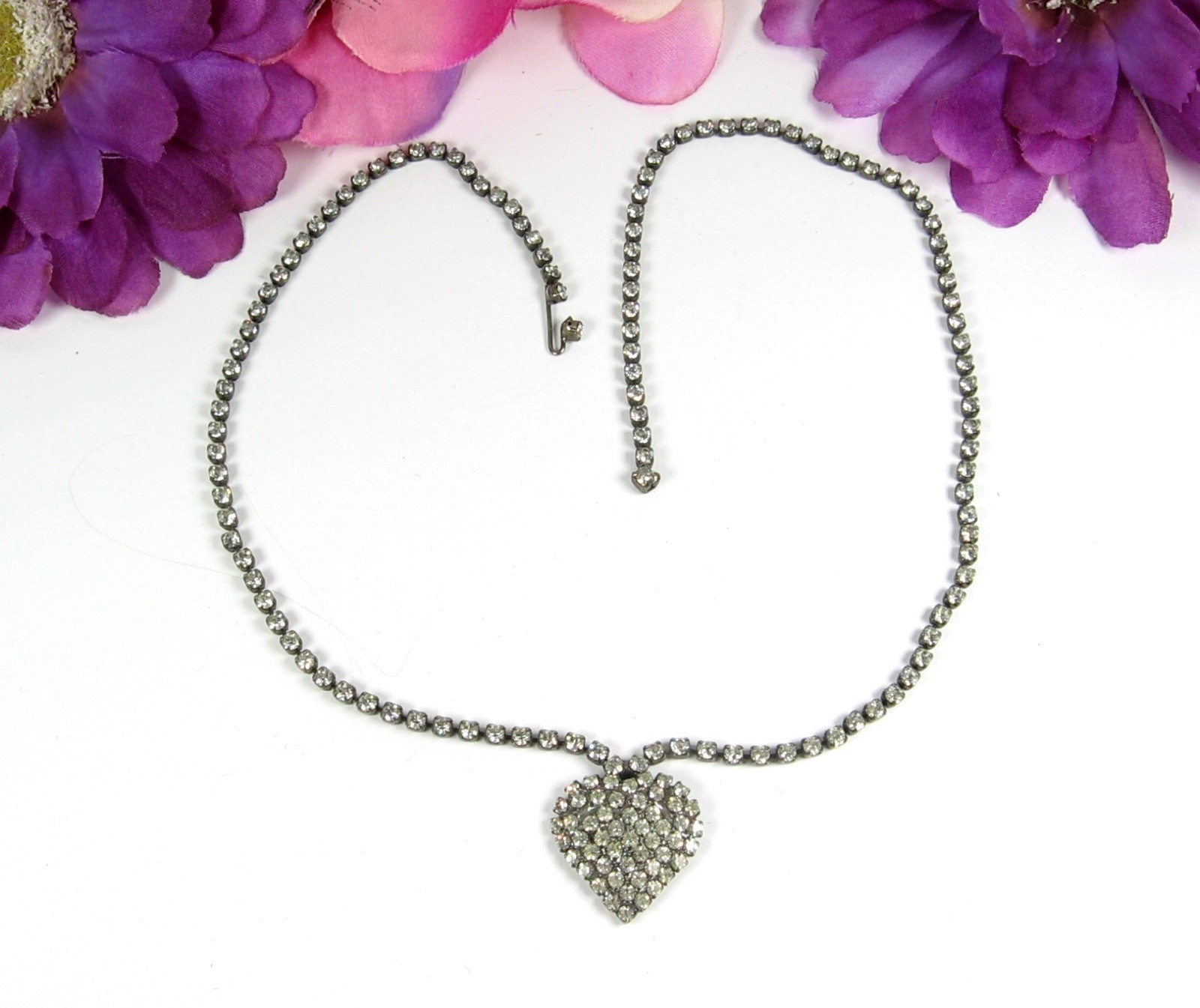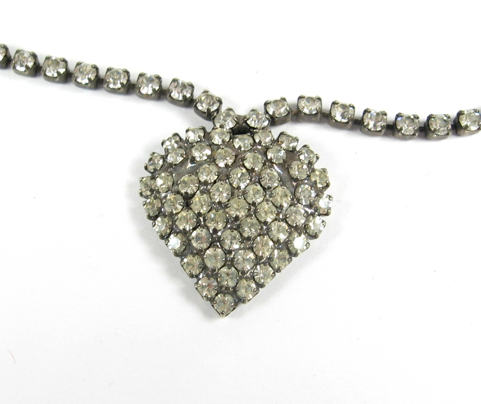 Vintage Pave' RHINESTONE HEART NECKLACE RS All Along Length Silvertone 17" Hook This is a VINTAGE FULL ON RHINESTONE HEART NECKLACE! In a silvertone metal, this vintage necklace is a STRING of rhinestones! At the front and center is an attached pendant of a Heart! Pave' with what you ask? RHINESTONES of course! RHINESTONES RHINESTONES EVERYWHERE! For the person who LOVES (heart) RHINESTONES! STONES: Rhinestones, round and clear METAL: Silvertone CLASP: Hook over chain MEASUREMENTS: Length of the necklaces is 17" , pendant measures about 3/4" in length. CONDITION: This piece of jewelry is in pre-owned and vintage used condition. The clasp is in full working order. All rhinestones are present, there are none missing. There is scratching and finish wear present. mrzipmdo Just Jewelry by MrZipMDO
