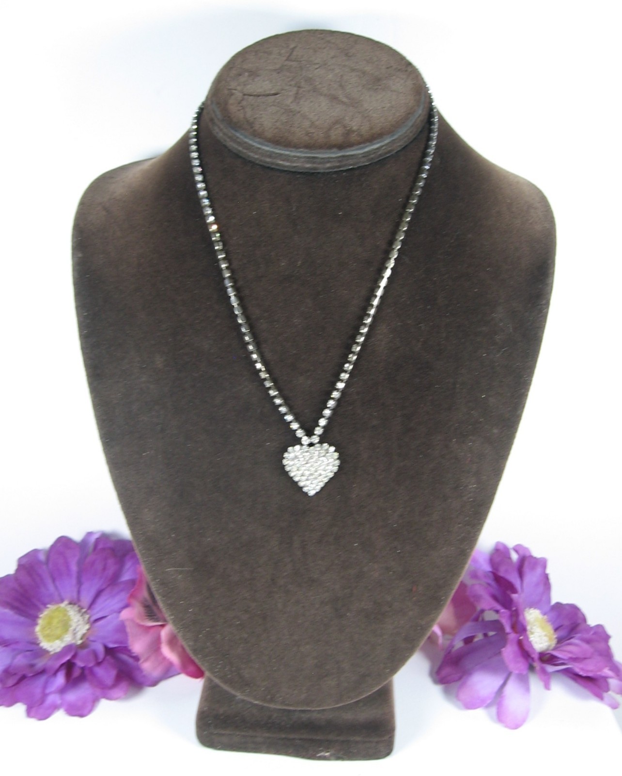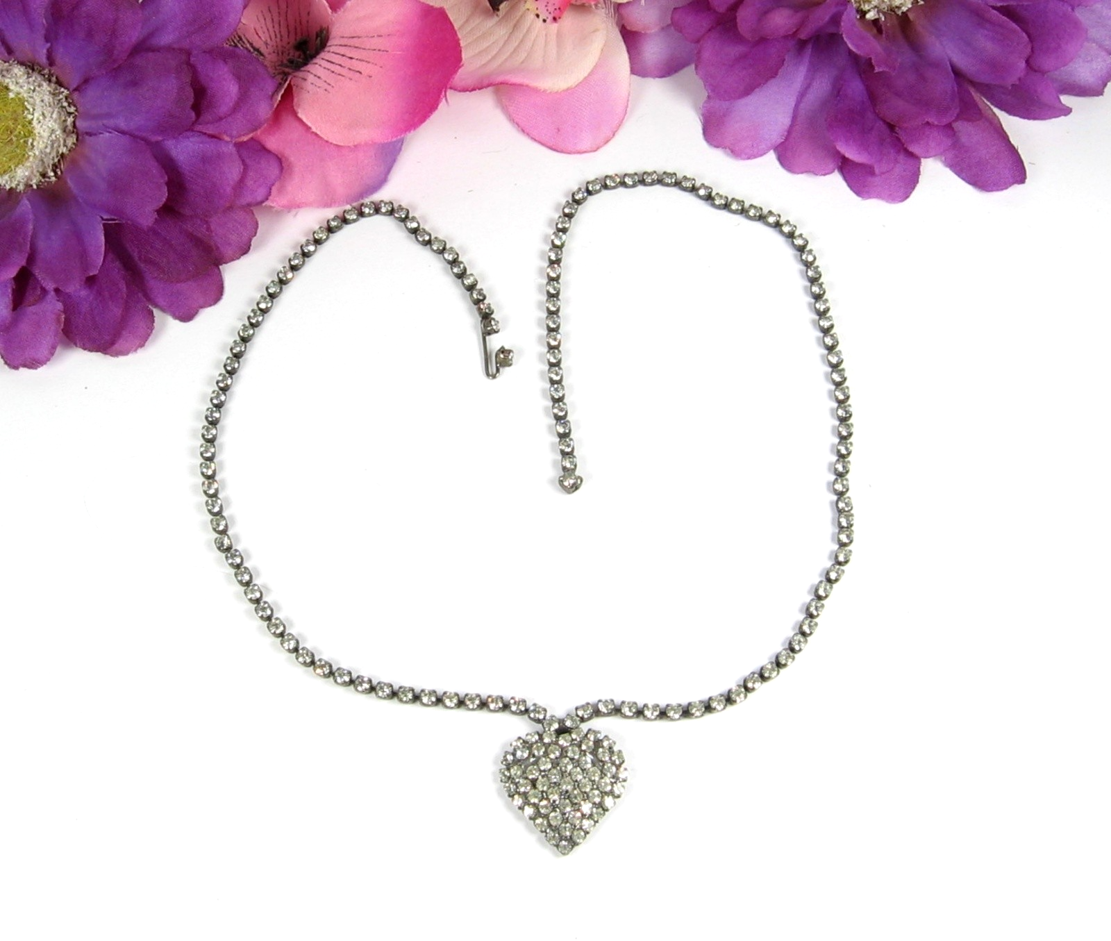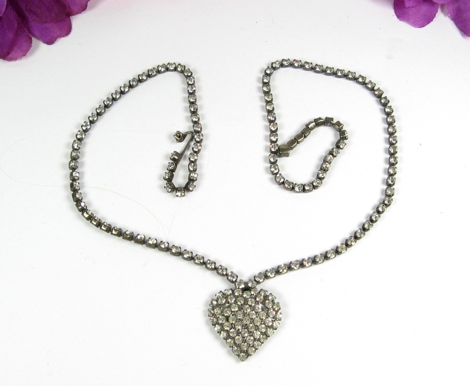 Vintage Pave' RHINESTONE HEART NECKLACE RS All Along Length Silvertone 17" Hook This is a VINTAGE FULL ON RHINESTONE HEART NECKLACE! In a silvertone metal, this vintage necklace is a STRING of rhinestones! At the front and center is an attached pendant of a Heart! Pave' with what you ask? RHINESTONES of course! RHINESTONES RHINESTONES EVERYWHERE! For the person who LOVES (heart) RHINESTONES! STONES: Rhinestones, round and clear METAL: Silvertone CLASP: Hook over chain MEASUREMENTS: Length of the necklaces is 17" , pendant measures about 3/4" in length. CONDITION: This piece of jewelry is in pre-owned and vintage used condition. The clasp is in full working order. All rhinestones are present, there are none missing. There is scratching and finish wear present. mrzipmdo Just Jewelry by MrZipMDO