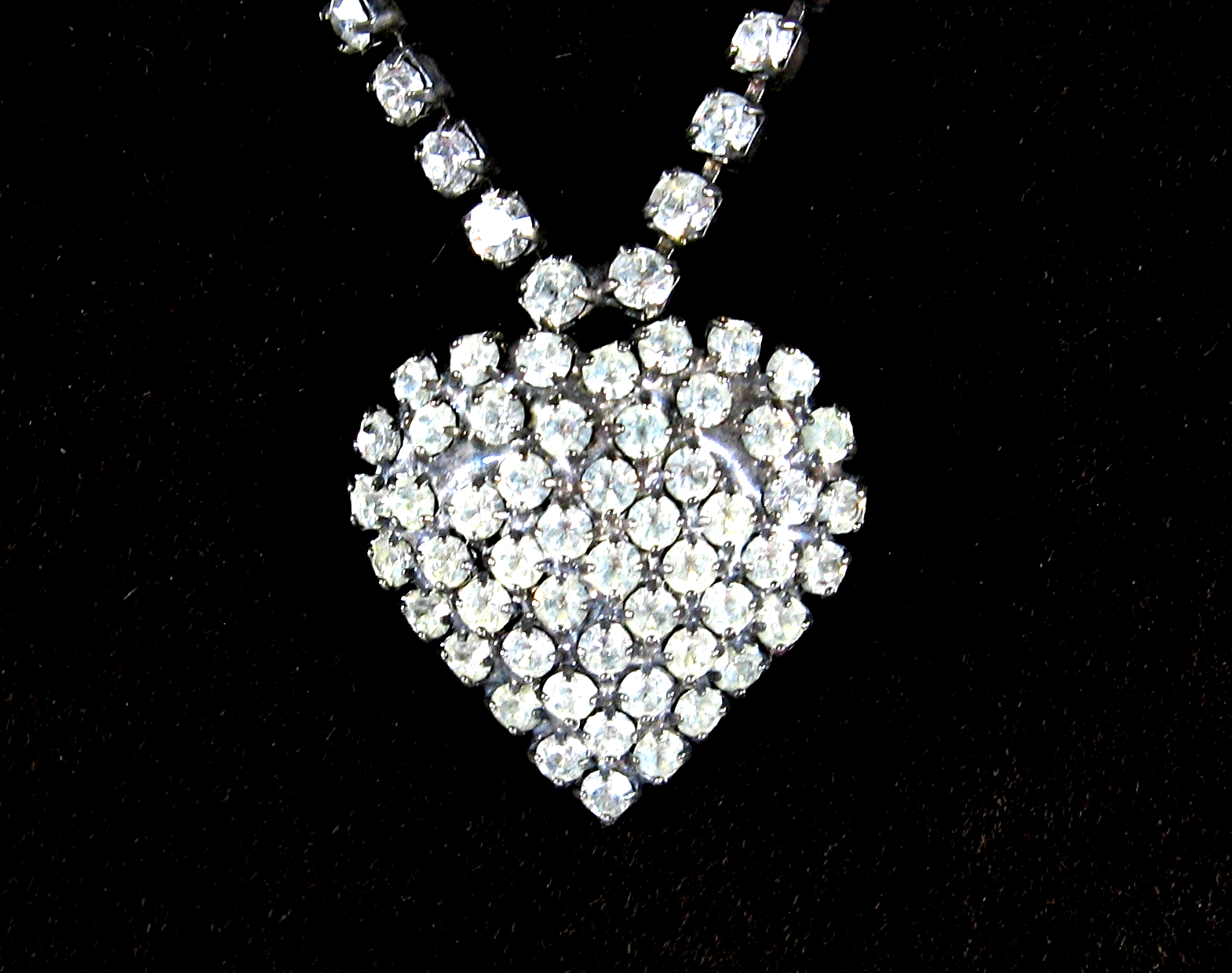 Vintage Pave' RHINESTONE HEART NECKLACE RS All Along Length Silvertone 17" Hook