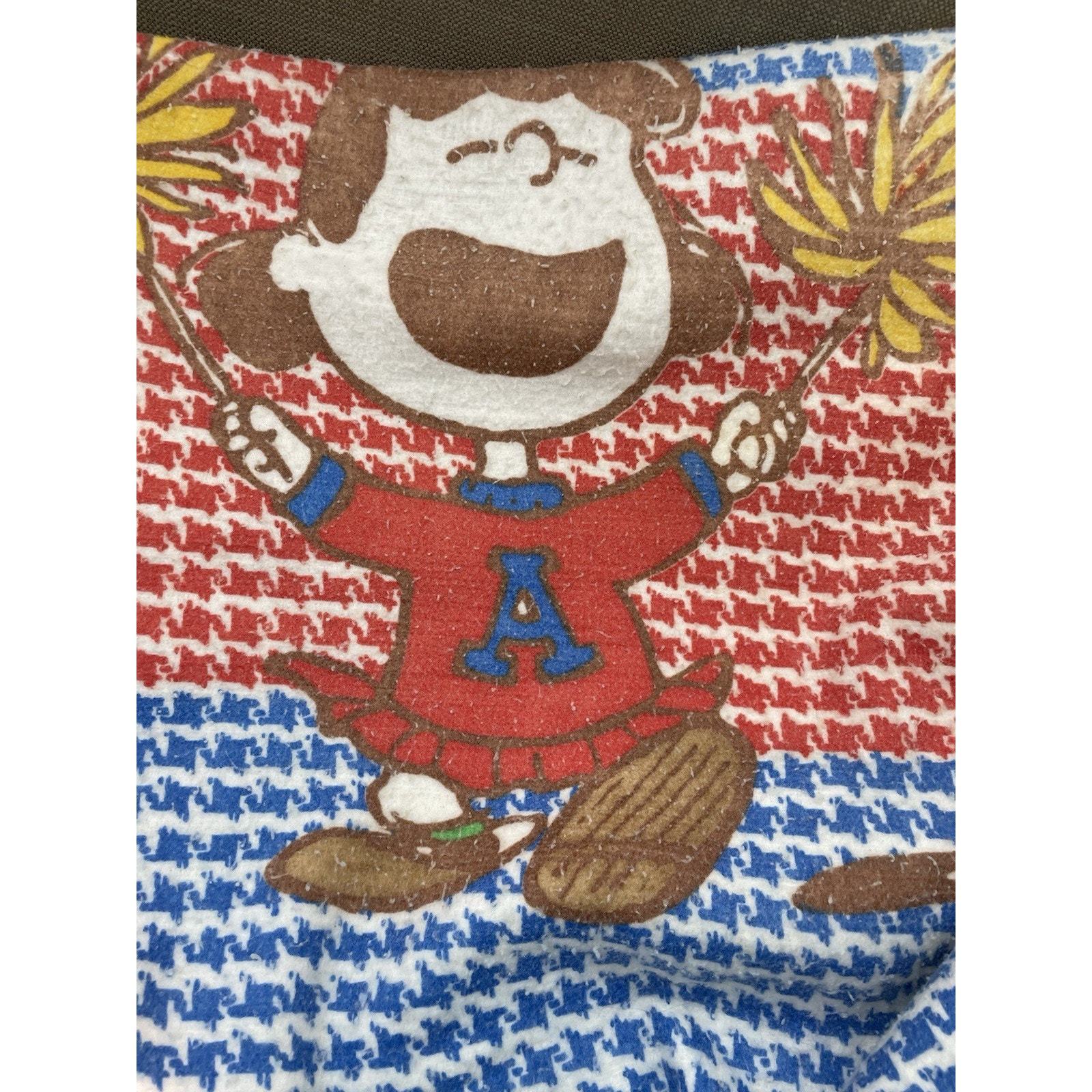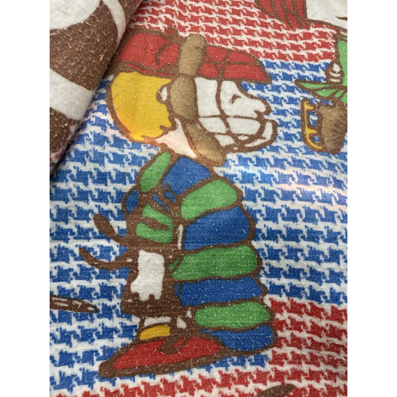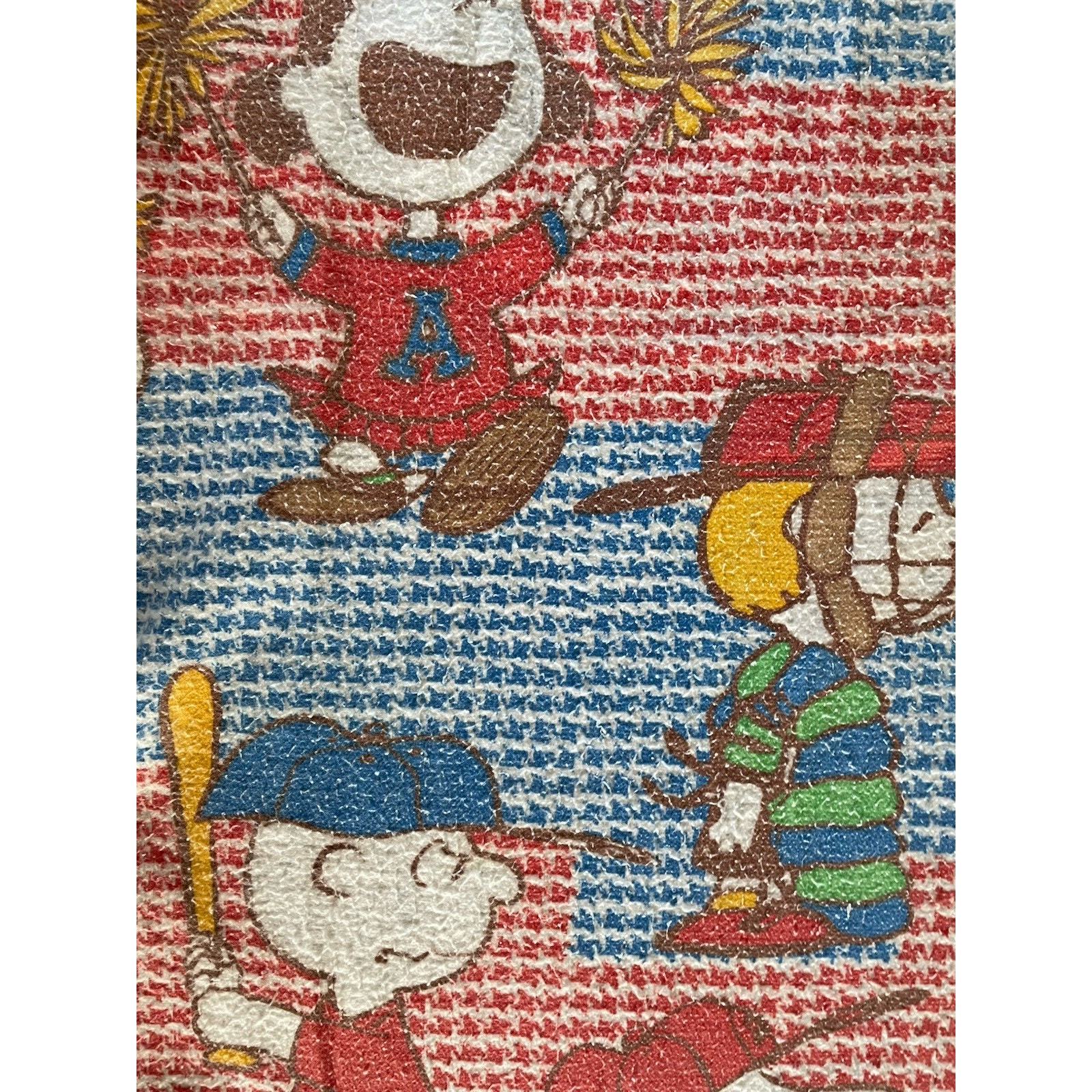 Vintage Peanuts Snoopy acrylic blanket featuring Snoopy, Charlie Brown, Lucy, and the gang in a playful cheer and baseball scene. This nostalgic blanket has a satin trim, acrylic fabric, and classic 1970s?1980s character artwork.
