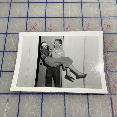 Vintage Photograph Man Carrying Blindfolded Woman 1950s Black And White Couple . Condition is Used. Shipped with USPS Ground Advantage.