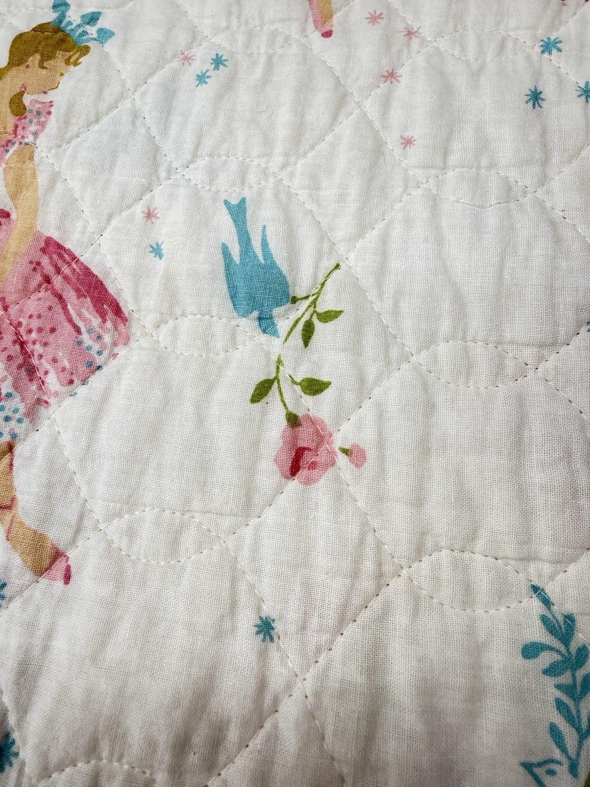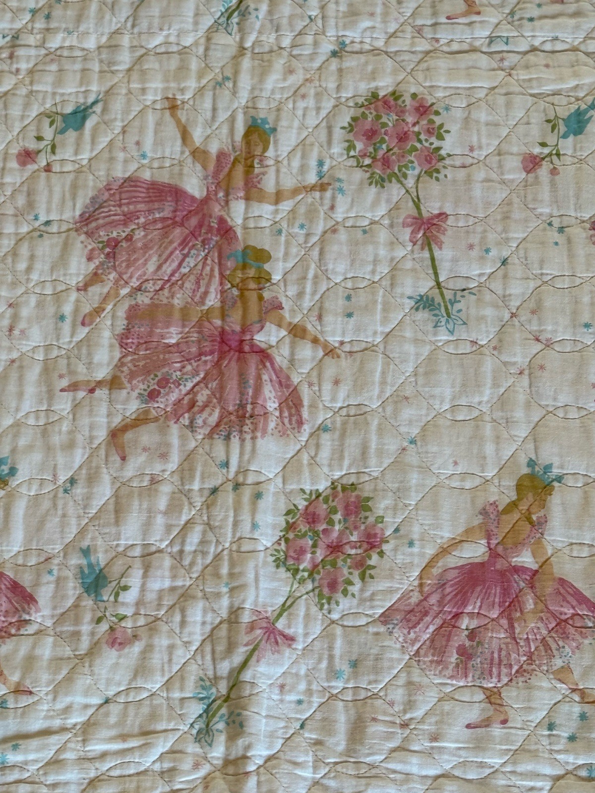 Lovely vintage quilted blanket featuring graceful ballerinas in pink dresses surrounded by floral bouquets and bluebirds on a soft ivory background. Measures approximately 57? x 81?, perfect for use as a bed coverlet or couch throw. The quilted stitching adds cozy texture, and the charming mid-century illustration style gives it a storybook fairy-tale feel. Beautiful condition with gentle wear consistent with age ? colors remain bright and crisp.