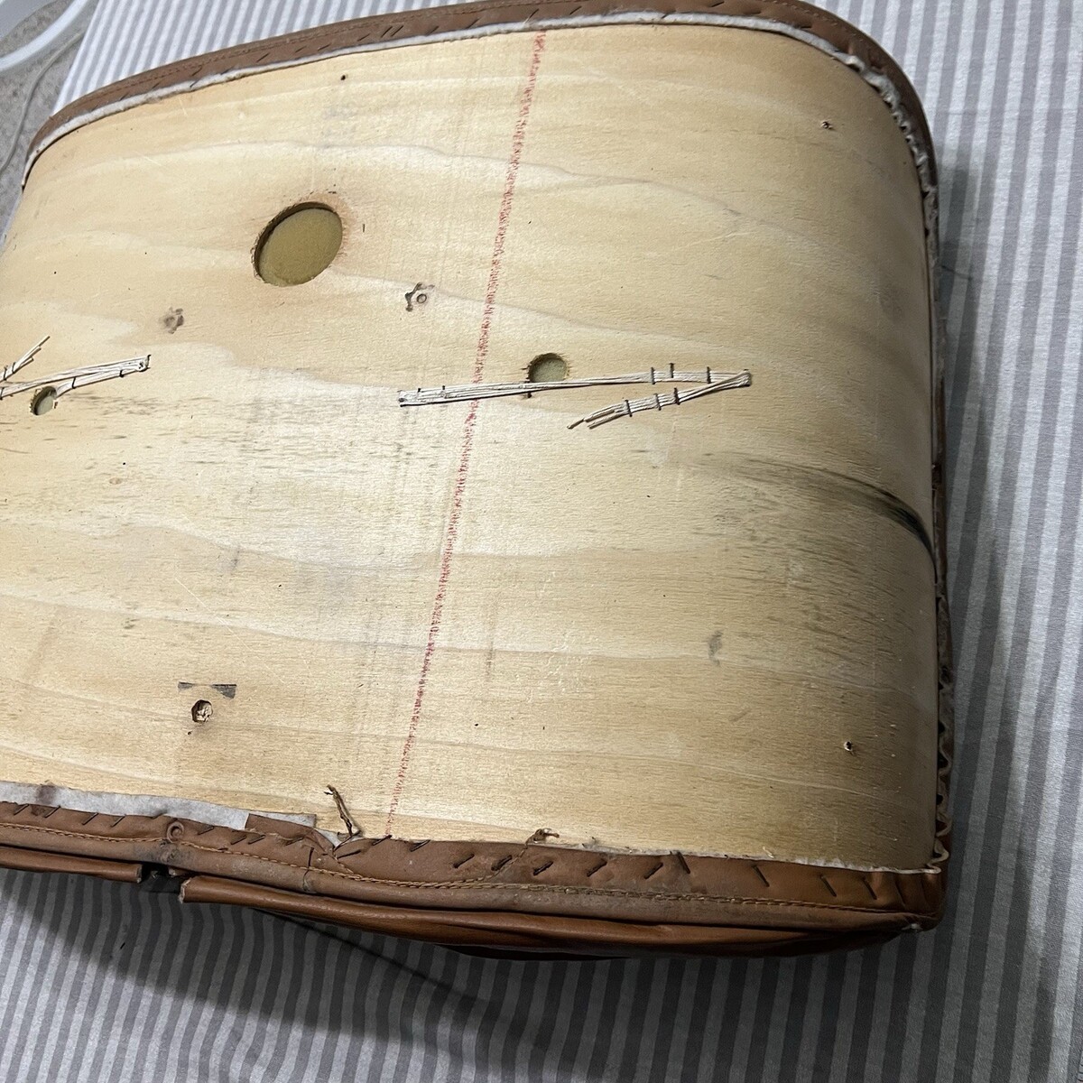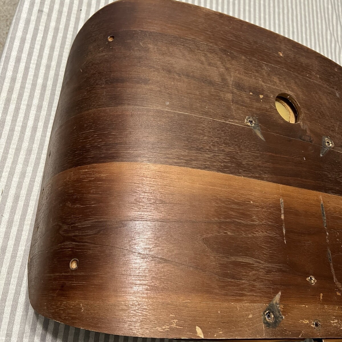 Vintage Plycraft lounge chair seat pulled from lounge chair for restoration. The material is discolored, worn and has some holes