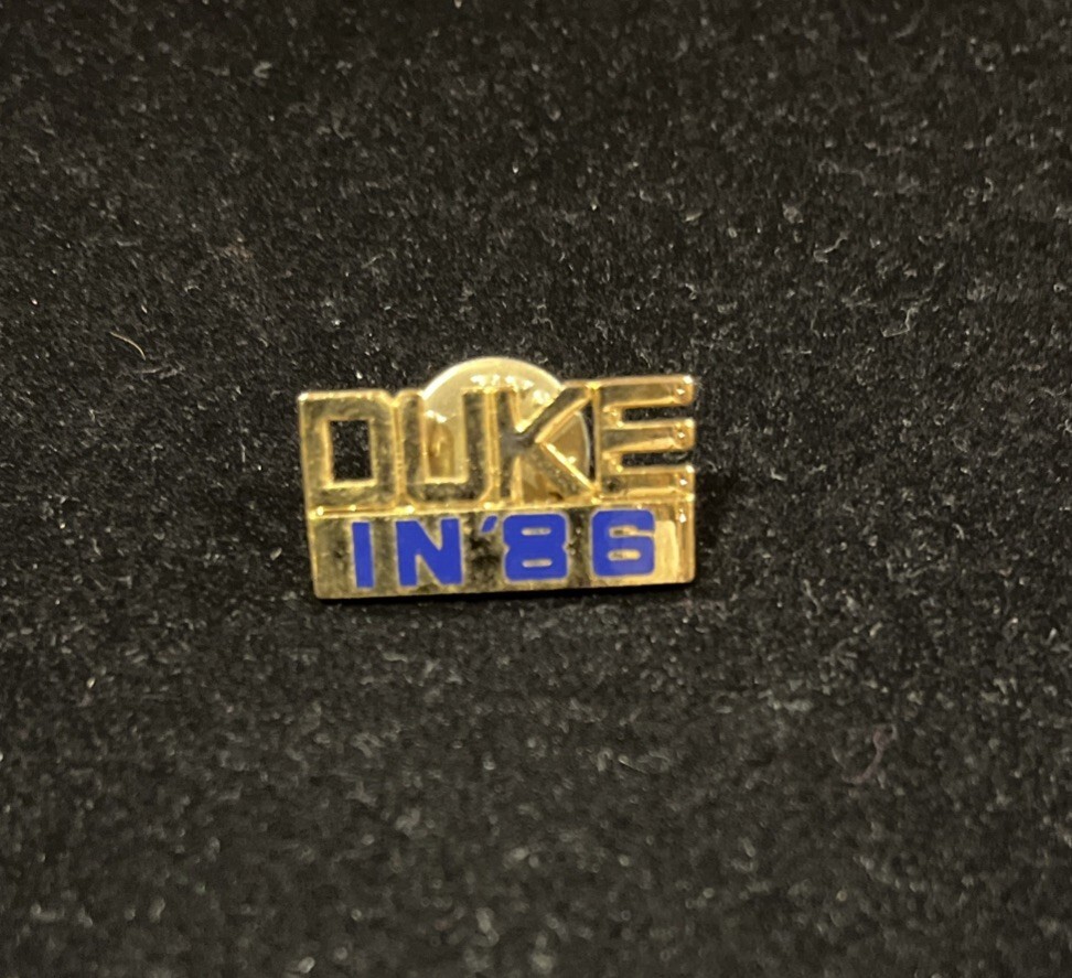 The product is a vintage political pin button featuring "DUKE IN '86", which likely refers to a campaign or political event from 1986. This pin represents the Republican Party and is a piece of historical memorabilia from the United States. It is a special item for collectors interested in political parties memorabilia, specifically focusing on United States politics and events from the 1980s. Very good condition.