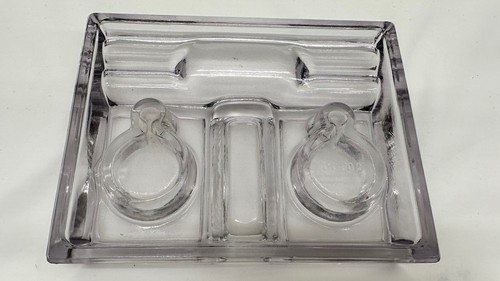 This vintage pressed glass inkstand is a unique addition to any collection. With dual-sided inkwells and pen/pin holders, it is perfect for any writing enthusiast. The inkwells are designed to hold purple ink and the glass material adds a touch of elegant style. Made in the United Kingdom, this inkstand is a testament to the quality of craftsmanship from that region. The vintage touch adds a sense of nostalgia to any desk or display. It is a perfect gift for any writer or collector.