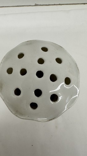This is a vintage porcelain hatpin holder made in Germany by R S. It measures 4-5/8" high and features a white and gold design. The holder is not handmade and is specifically designed to hold hatpins.