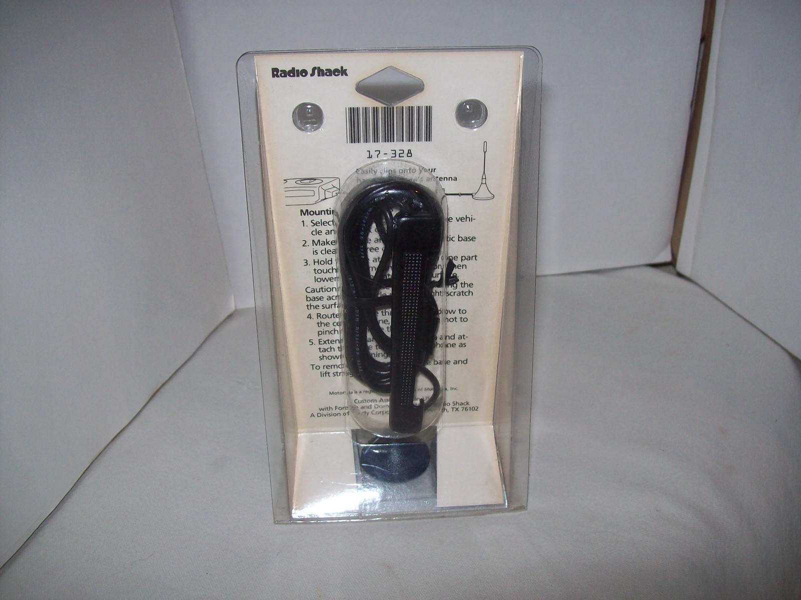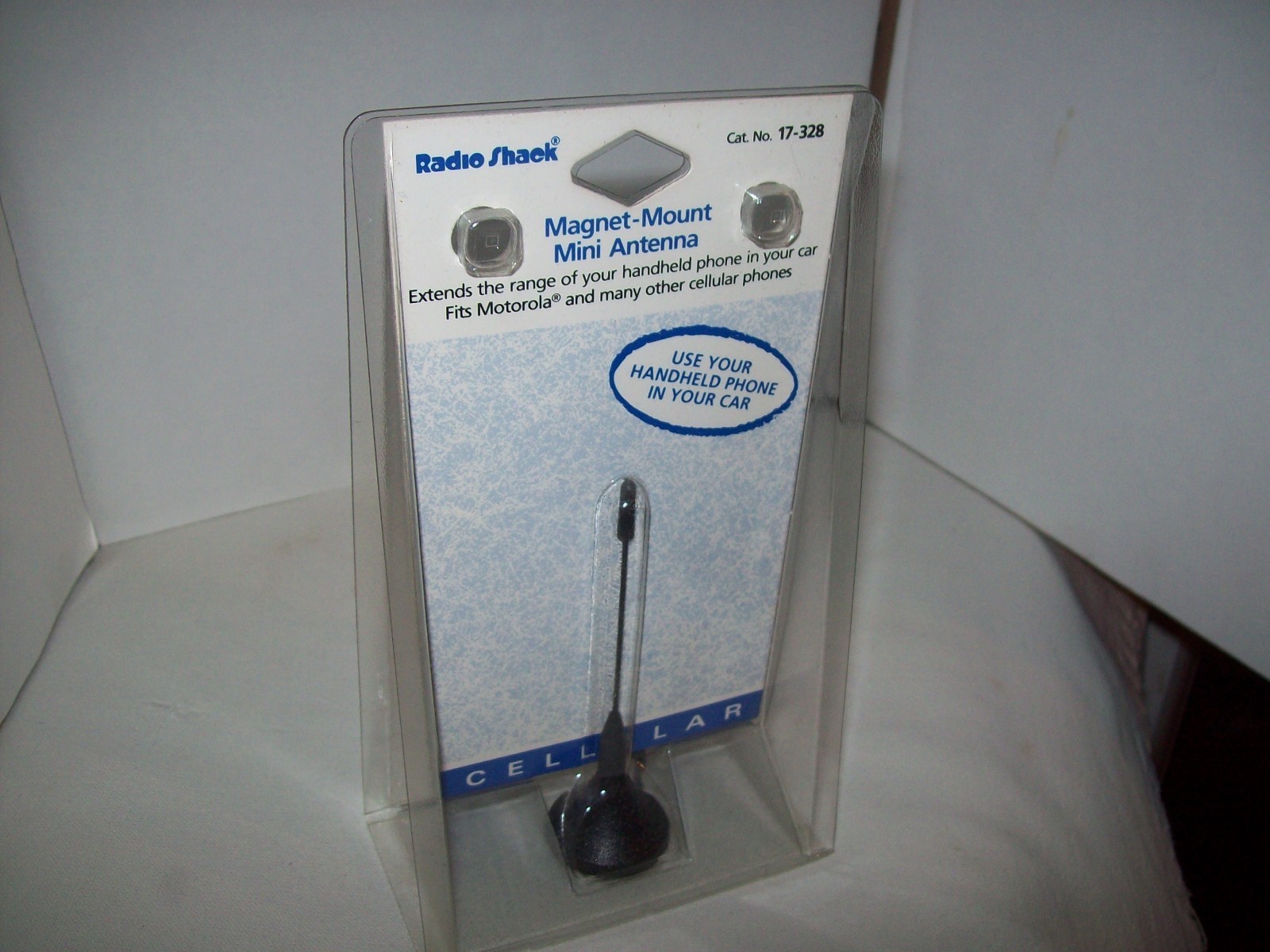 Vintage Radio Shack Cell Phone Magnetic Mount Mini Antenna 17-328 for Motorola From the 1998 Radio Shack catalog: (Page 48, Cellular antennas adapters section) Clip -on antenna Perfect for rental cars or multi - car families. Clip adapter to handheld's antenna. Magnetic antenna mounts on roof. Motorola. 17-328 ...29.99 Free shipping in the USA.
