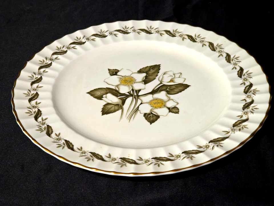 no evidence of damage or wear. Pattern features a floral and classical style with elements of both Victorian and Art Nouveau design, with a fluted inlay and gold trim. Artistry includes white flowers with hints of yellow and pink, and deep green/gray leaf garland on bone china. These design details lend themselves to a classic and delicate aesthetic that remain popular today. Measures 10.5" in diameter. Circa 1947-1961.