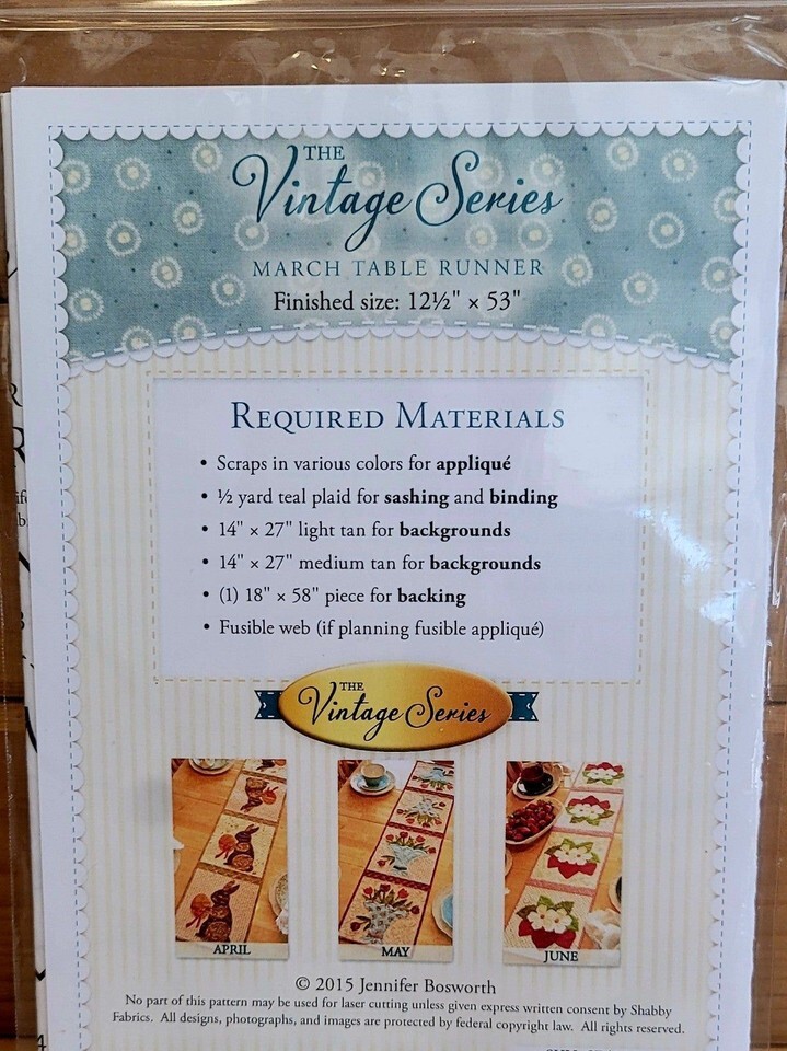 Vintage Series Sewing Pattern March Table Runner Shabby Fabrics 12.5 x 53 New, unused. From Shabby Fabrics. Some wear on packaging from storage B55