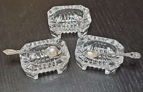 UP FOR SALE: Vintage Set of 3 Open Footed Crystal Salt Cellars with 2 Two 925 Silver Spoons PLEASE REFER TO ALL PHOTOS FOR A BETTER VISUAL DESCRIPTION OF THE ITEM *Vintage and secondhand items may have flaws. Please review item(s), description and picture(s). I do my best to research and describe the items accurately, but I am not an expert on all of the items I sell. Unless specified in the listing, all items are sold AS-IS AS-SEEN in photos* All of My Items Come from a Smoke Free Home and have been cleaned per's standards I do Ship everyday Monday - Saturday Feel Free to Visit My Store and Browse Through My Other Listings as I am happy to combine shipping for you. Please contact me with any issues prior to leaving negative/neutral feedback or low detail ratings, as I will always do my best to solve any problems that may come up! If you have any further questions, please feel free to message me Any props that are used in the taking of the photos are not included. Only the item/items in the title of the listings are being sold