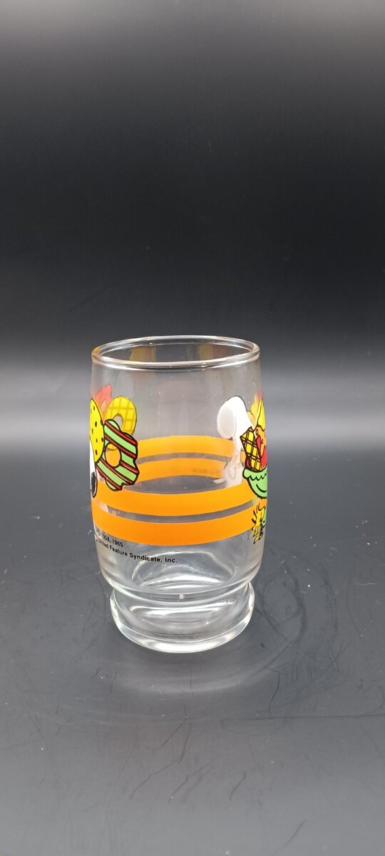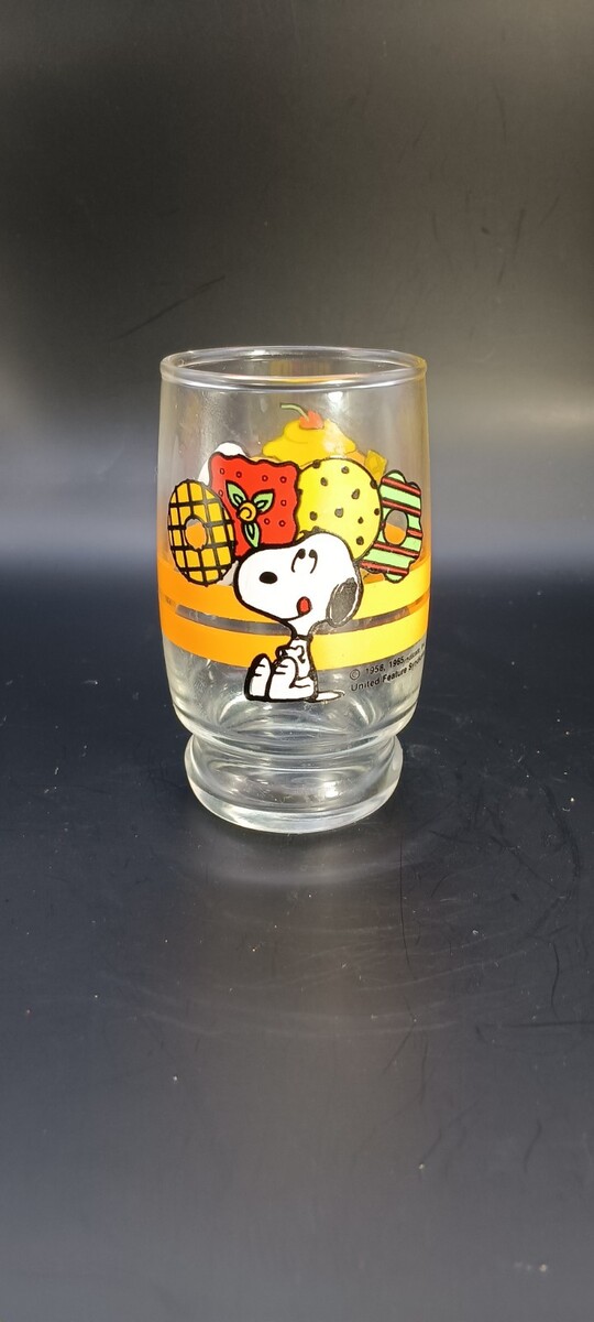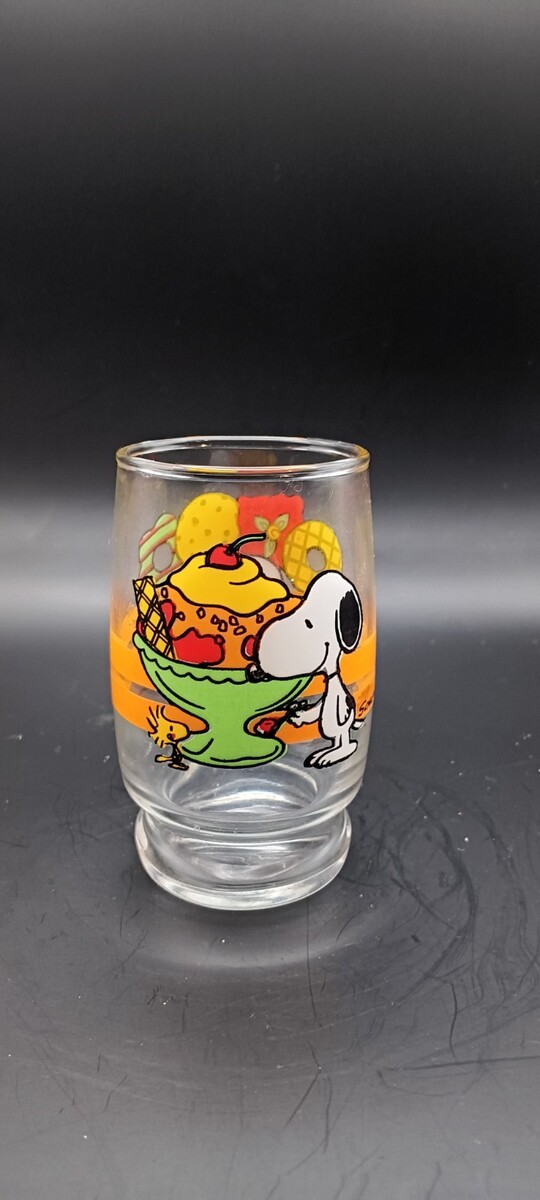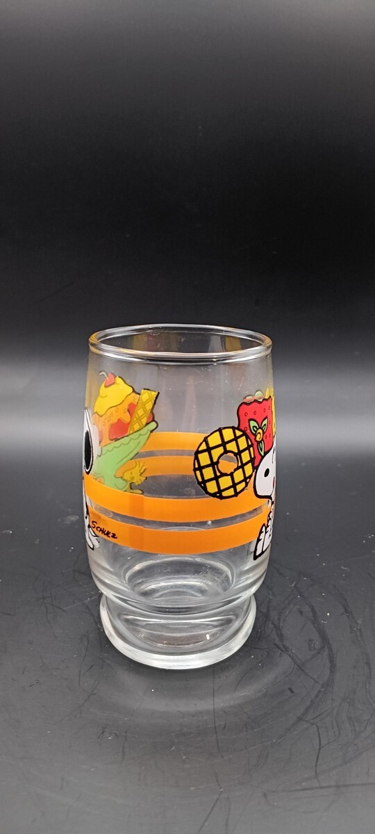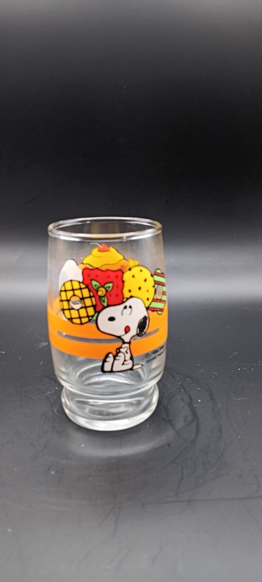 Vintage Snoopy Juice Glass, H 4" X W 2", Desserts Motif, Anchor Hocking.