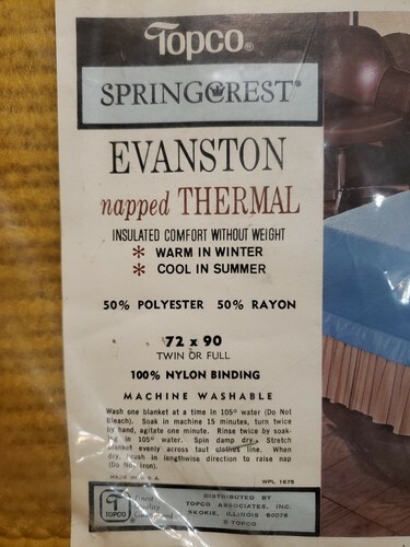 Vintage SpringCrest 100% Nylon Napped Thermal Blanket 72x90 Twin / Full size, Mustard Yellow Condition is "New". Shipped with USPS First Class (3 to 5 business days). Evanston Napped Thermal Insulated Comfort Without Weight. Warm in Winter, Cool in Summer. 50% Polyester 50% Rayon. 72" x 90" Twin or Full size. 100%Nylon Binding. MACHINE WASHABLE. MADE IN U.S.A.