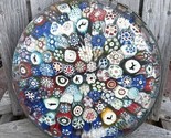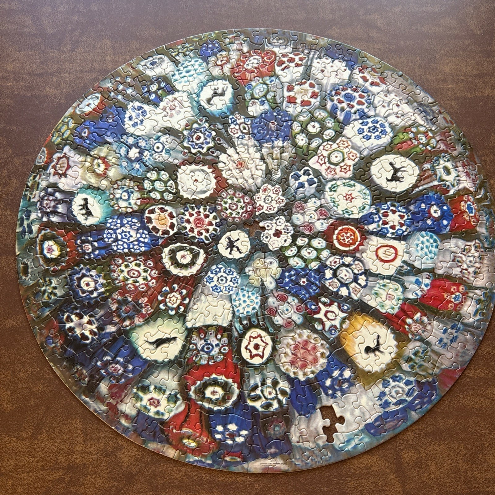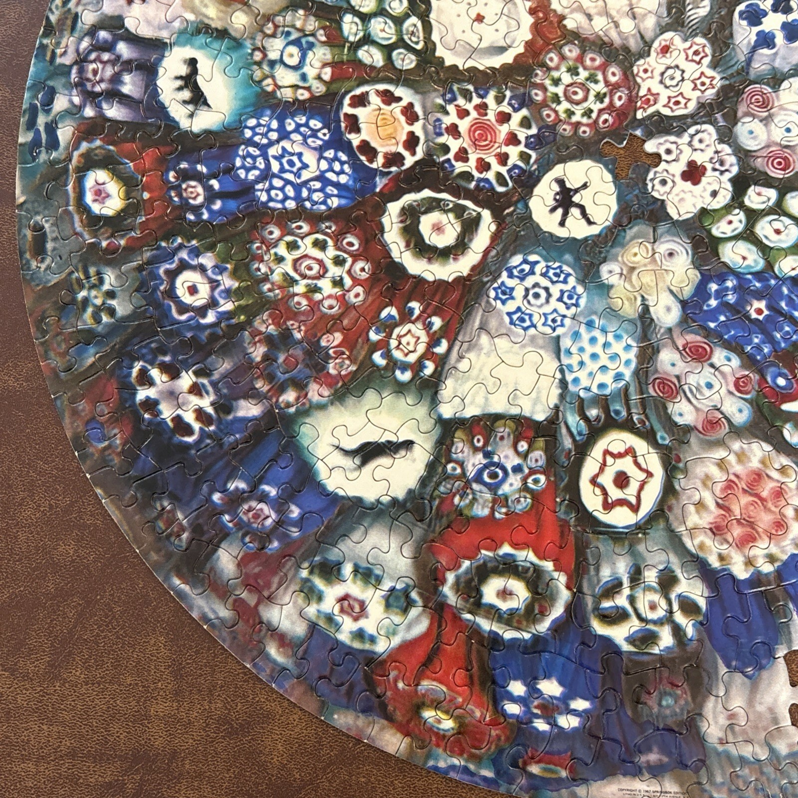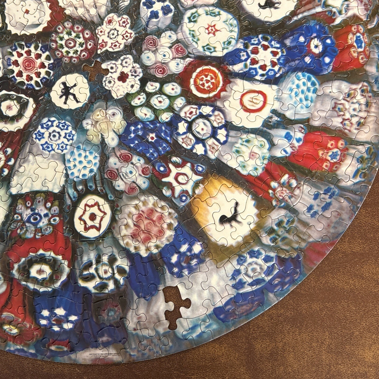 Vintage 1967 Springbok Circular Puzzle Baccarat Millefiori Paperweight jigsaw puzzle features a colorful and intricate design of collectible Italian art glass images Estimated 500-600 pieces. Box doe not indicate the count. Finished puzzle is 20.5" Super challenging (2 persons over 2 days) Made in the United States Vintage and timeless 2 pieces missing. A tracing template pencil rubbing image and placement is included to create a replacement piece. Box has been taped together over the years.