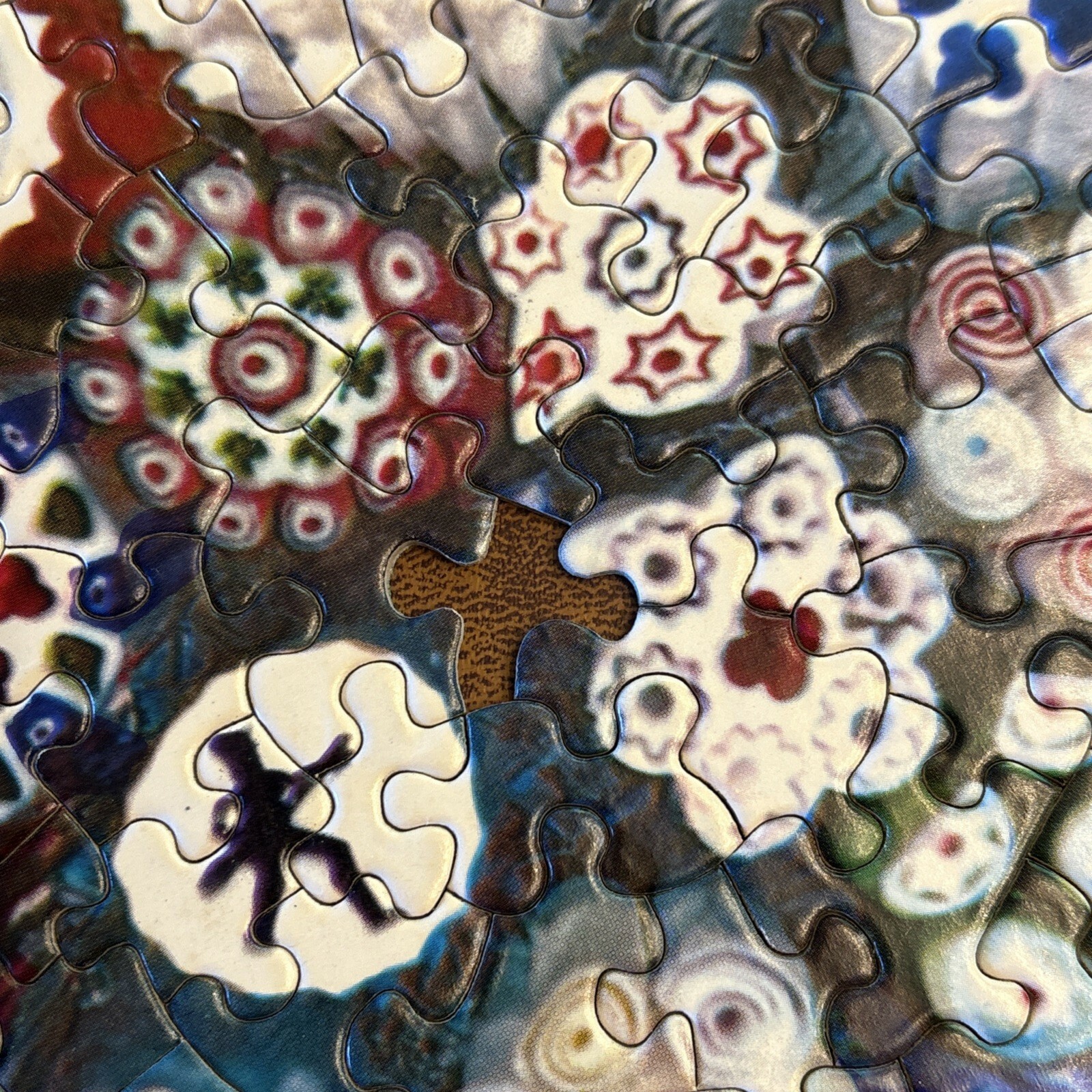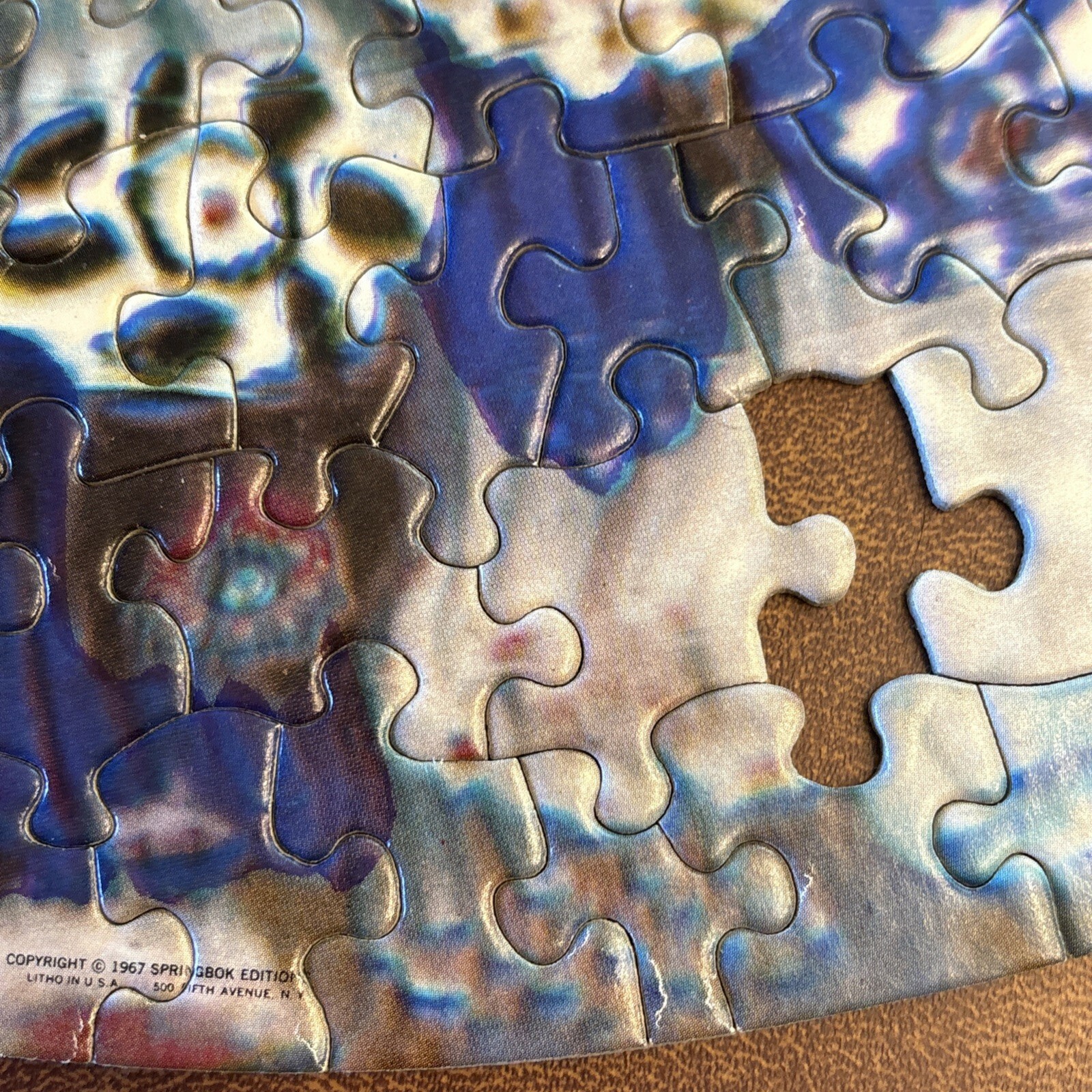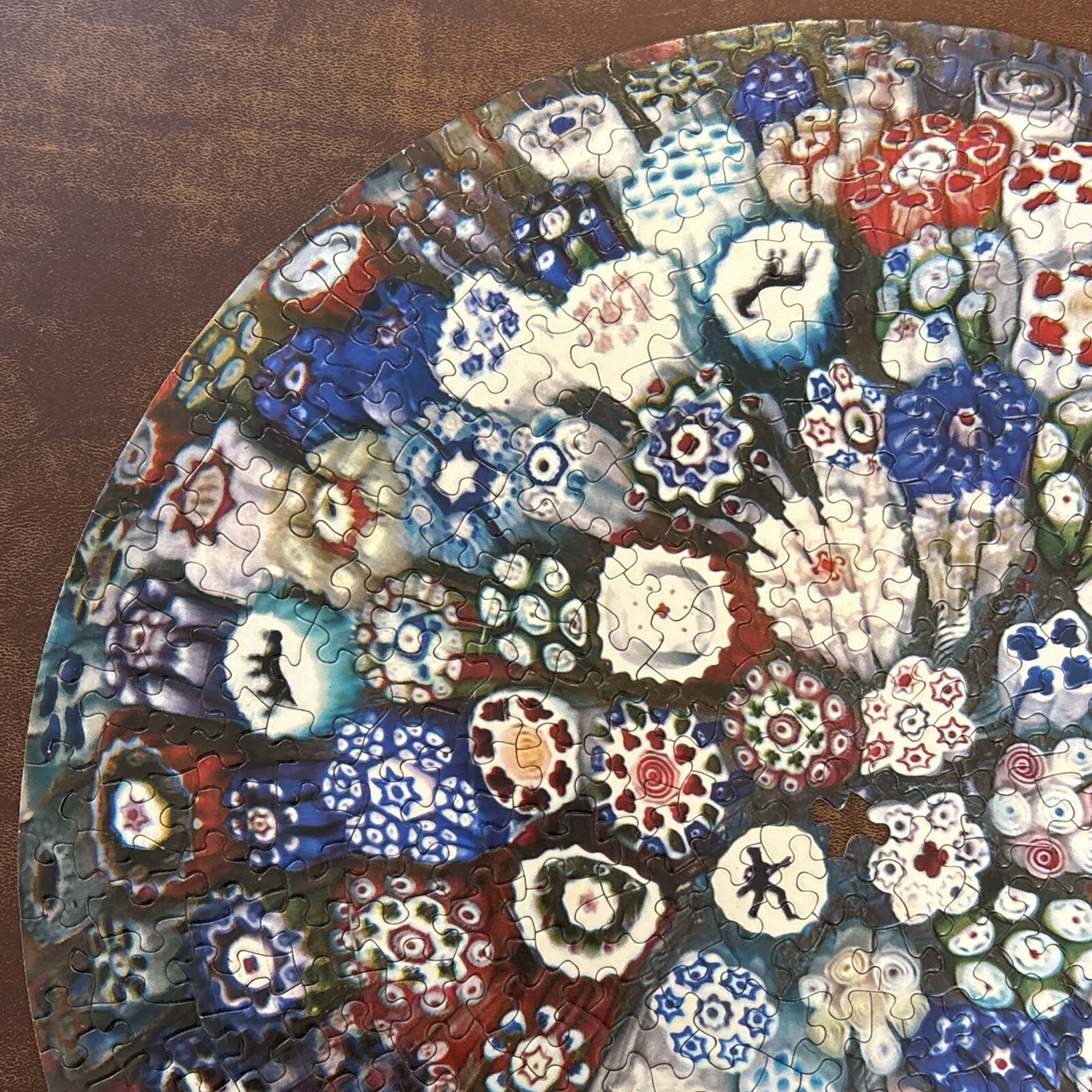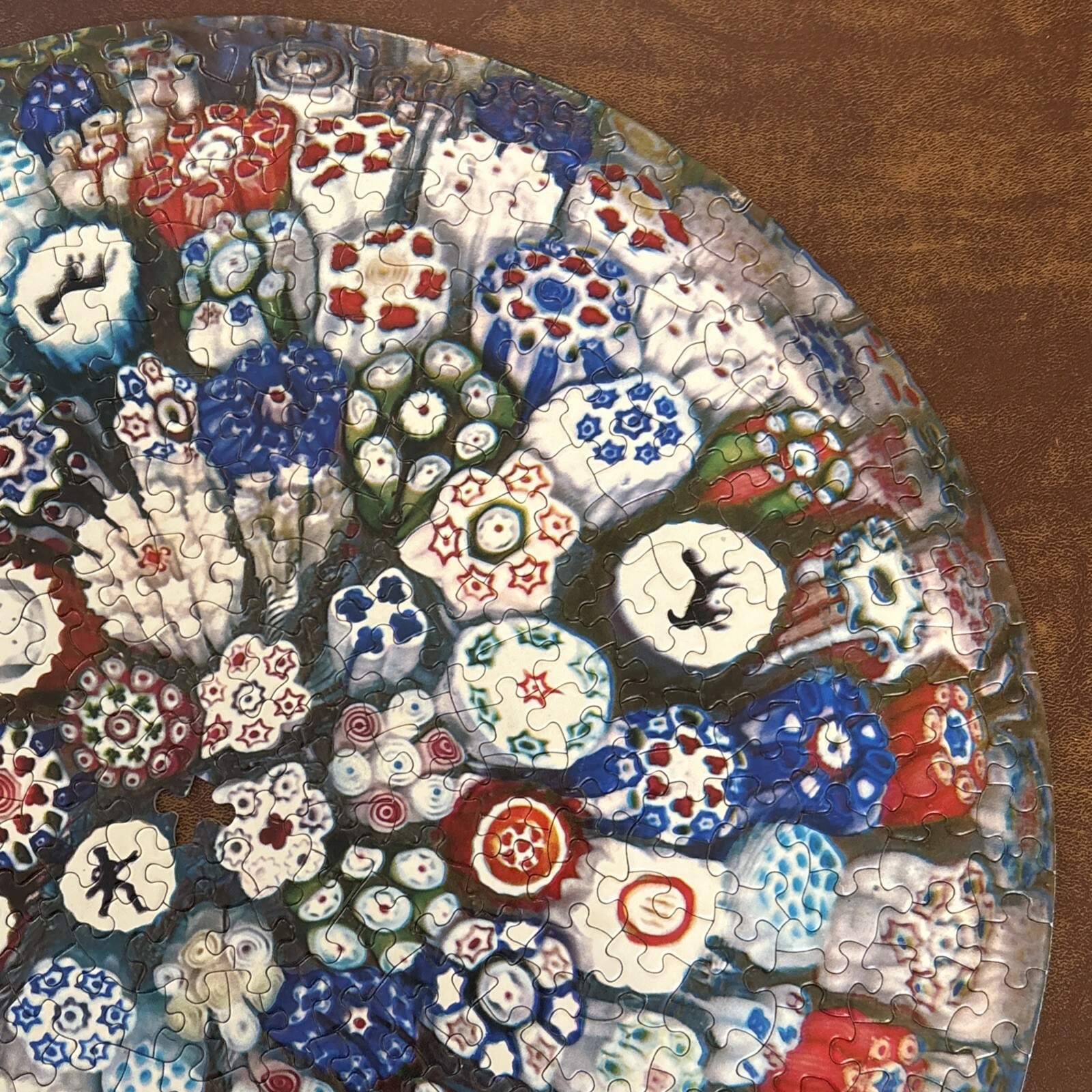 Vintage 1967 Springbok Circular Puzzle Baccarat Millefiori Paperweight jigsaw puzzle features a colorful and intricate design of collectible Italian art glass images Estimated 500-600 pieces. Box doe not indicate the count. Finished puzzle is 20.5" Super challenging (2 persons over 2 days) Made in the United States Vintage and timeless 2 pieces missing. A tracing template pencil rubbing image and placement is included to create a replacement piece. Box has been taped together over the years.