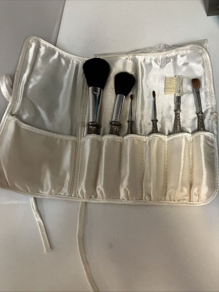 This product is a set of 6 vintage style silver plate makeup brushes packaged together in an ornate vanity set. Each brush is designed with intricate detailing and a silver plate material, adding a touch of elegance to any vanity or dressing table. Perfect for those who appreciate classic and timeless beauty in their makeup tools or collectibles. Estate sale find. Brushes look unused. You get it as we found it! Will ship USPS with tracking to winning buyer