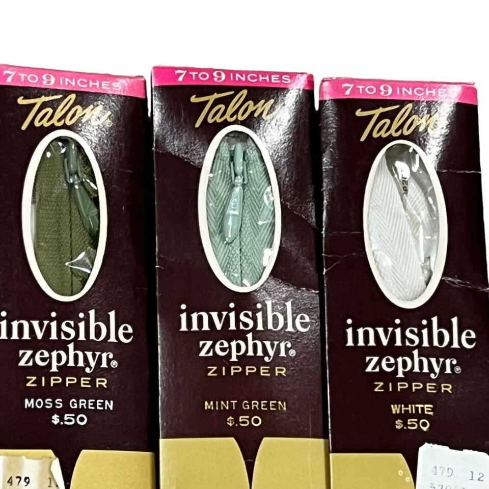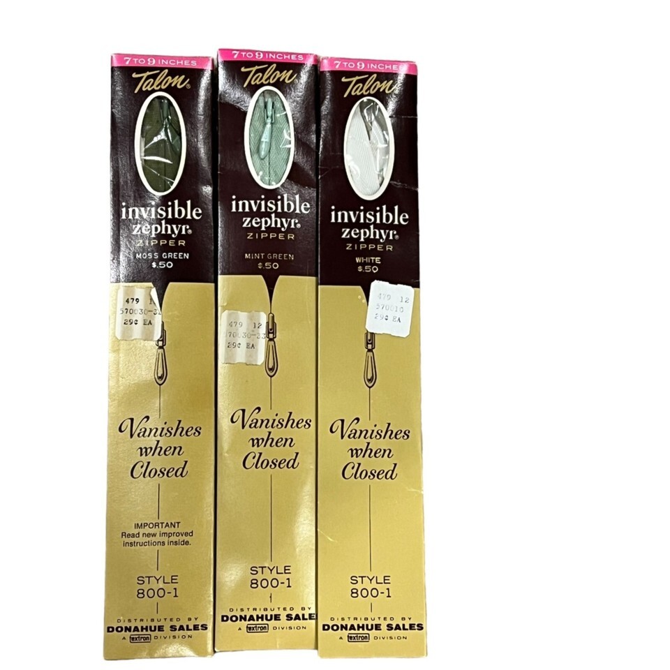 These vintage Talon zippers from the mid-20th century are ideal for restoring or creating garments with an authentic retro look. ? Length: 7"-9" ? Color Selection Choice: White, Moss Green, Mint Green ? Style 800-1 ? Vanishes When Closed ? Original Packaging