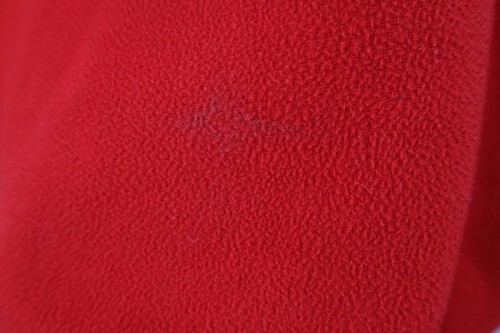 Blemishes front top. Stains right cuff, back. Collar, cuffs discolored. Color faded. Pilling, fabric matted