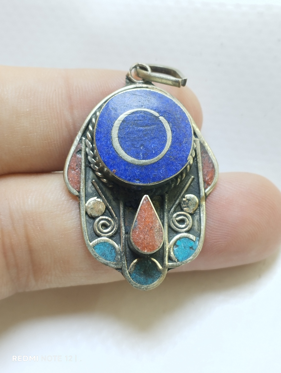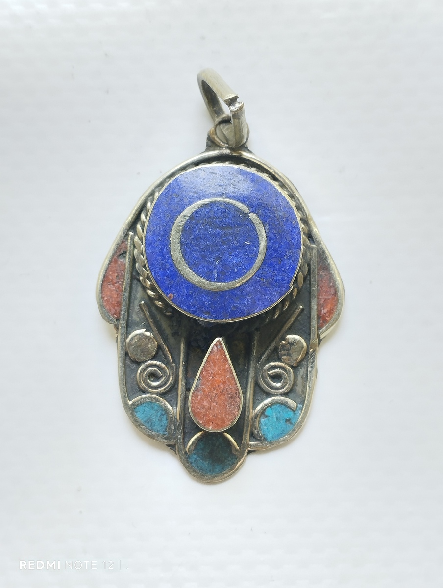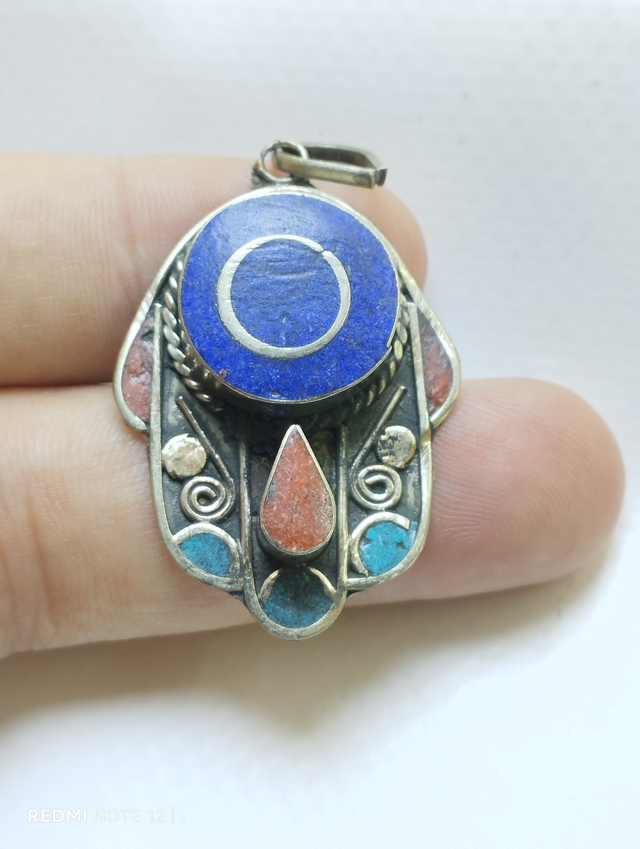 - Vintage Tibetan Handmade Pendant – Lapis Lazuli, Turquoise & Coral Inlay
