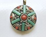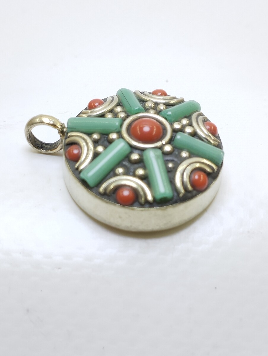 - Vintage Tibetan Round Pendant with Coral & Green Inlay – Boho Ethnic Jewelry