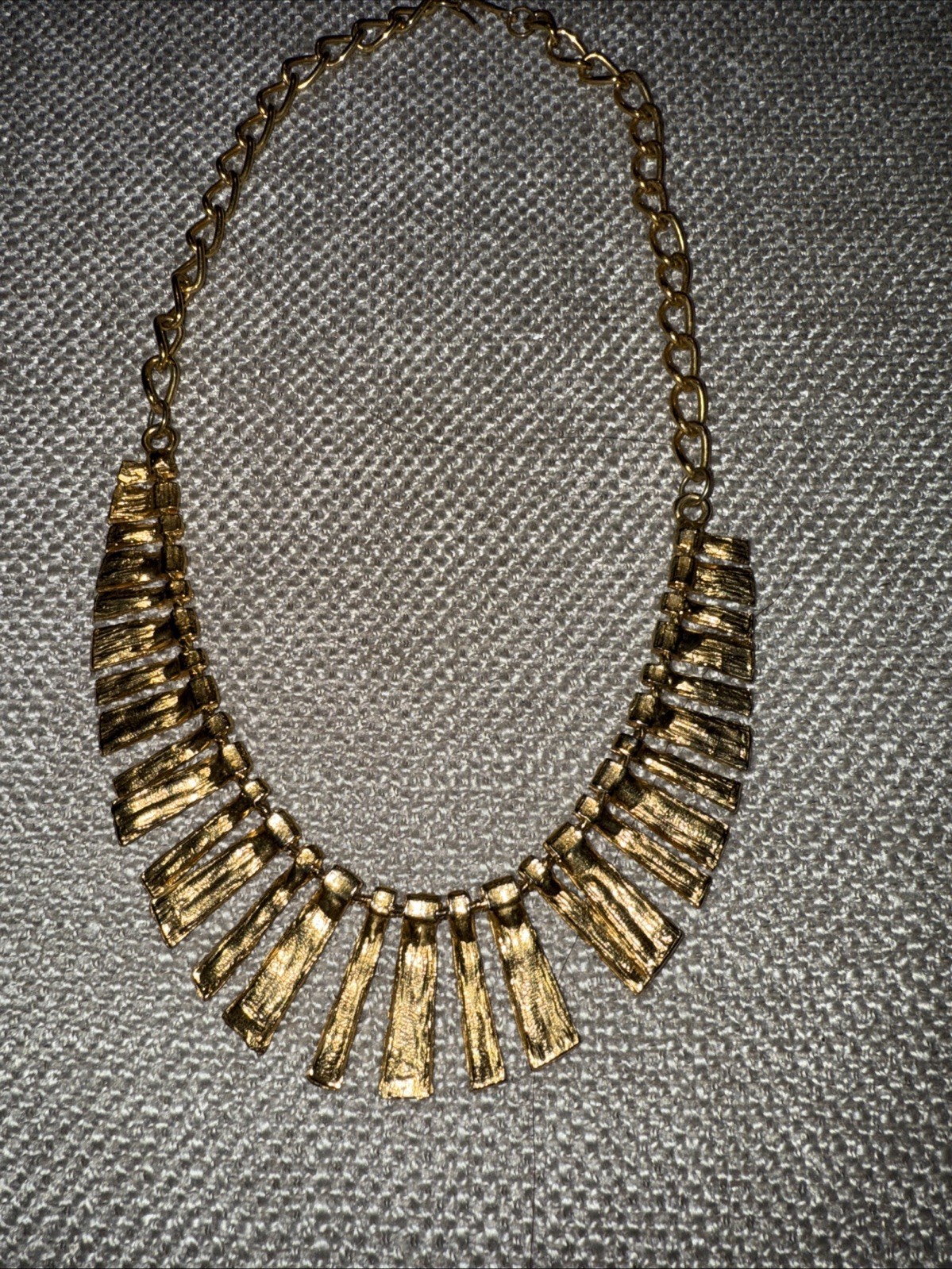 The product is a vintage "Ultra Craft" Egyptian gold plated two-sided bib necklace. This unique necklace features a bib style design with a two-sided pendant, showcasing intricate craftsmanship and a touch of elegance. The gold plating adds a luxurious touch to the piece, making it a standout accessory for any vintage jewelry collection. Perfect for adding a statement to any outfit, this necklace is a timeless and stylish addition to any wardrobe.