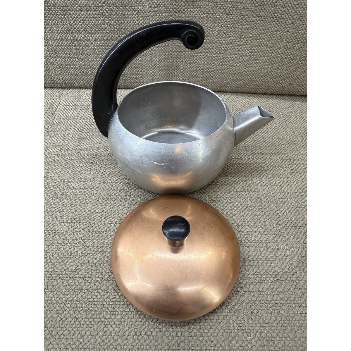 Classic mid-century Wear-Ever Hallite cookware set, featuring two saucepans with lids and a tea kettle, all crafted from durable aluminum with copper-toned lids and Bakelite handles and knobs. Marked Wear-Ever ? Made Only by Wolverine, Pittsburgh, PA.