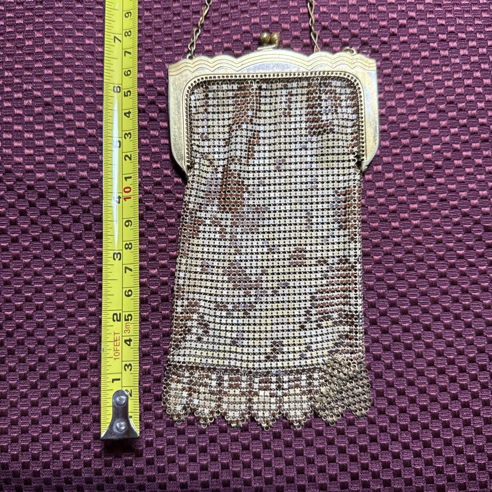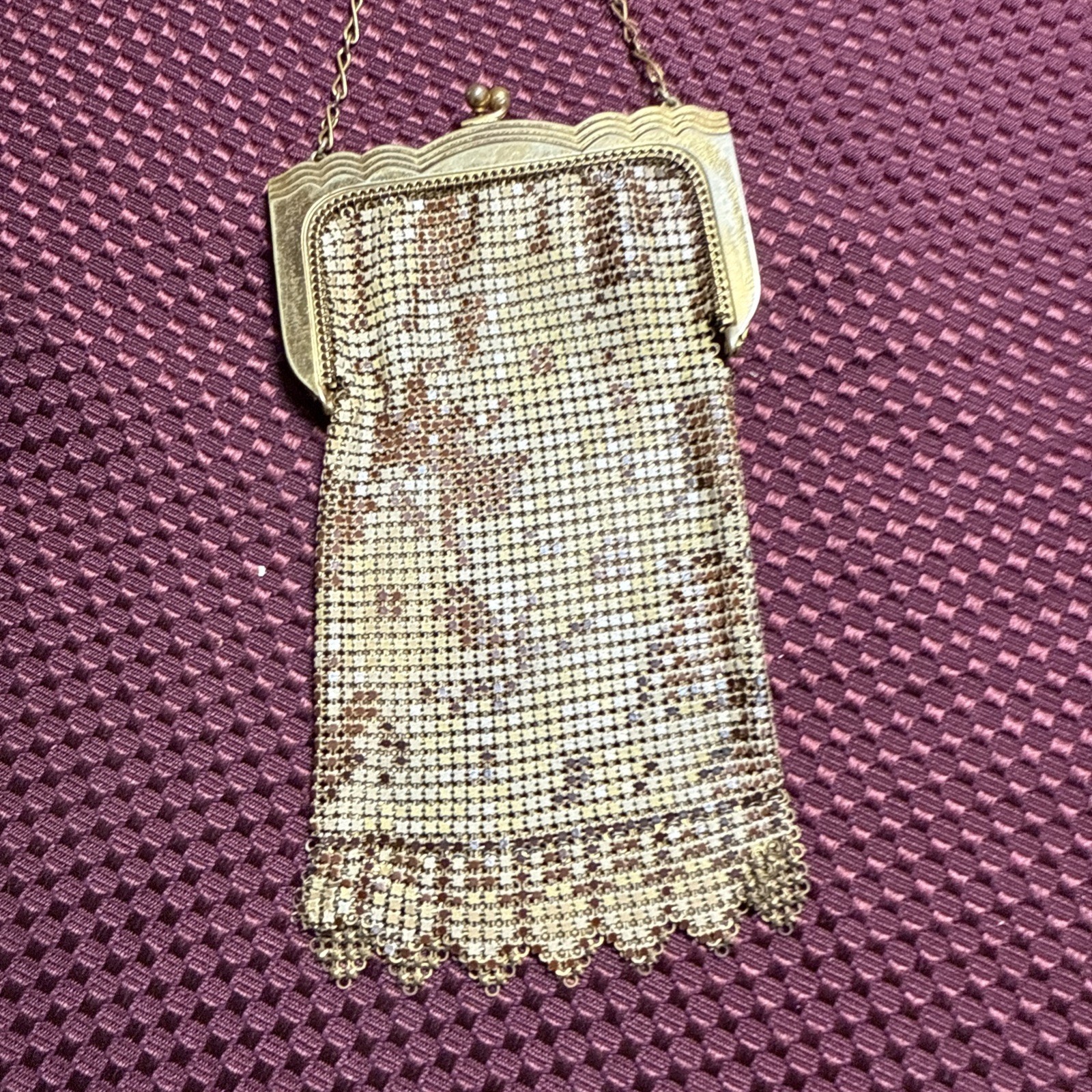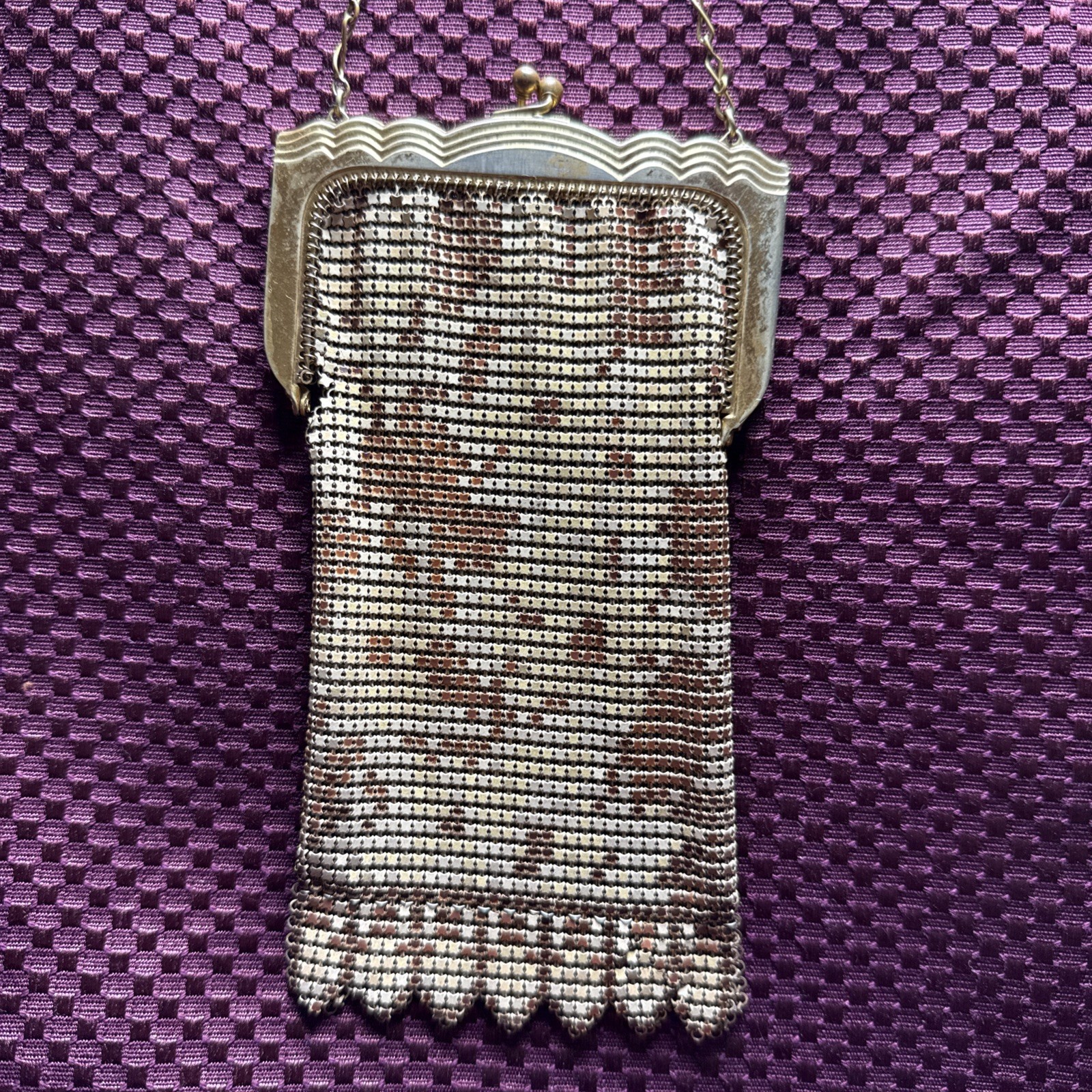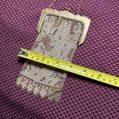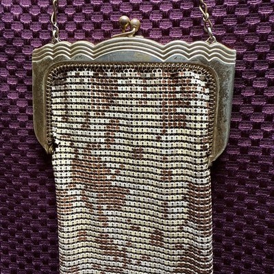 Vintage Whiting Davis Gold Flat Armor Mesh Purse With Gold Chain Strap Flapper Good condition bright and vibrant! Some tarnish See photos for measurements and determine condition This is a Whiting Davis metal mesh evening bag, a brand renowned for its innovative ?flat armor? or ring mesh construction, patented in 1909 by the Massachusetts-based company founded in 1876. The colorful bright gold tone and ornate frame with a kiss-lock clasp and chain strap align with their designs from the 1920s to 1930s, a peak period during the Art Deco era. Whiting Davis bags were celebrated for their durability and elegance, often used as formal accessories by flappers and high-society women. The scalloped edge and intricate beadwork suggest it could be from their classic line, possibly a collector?s piece if in good condition.