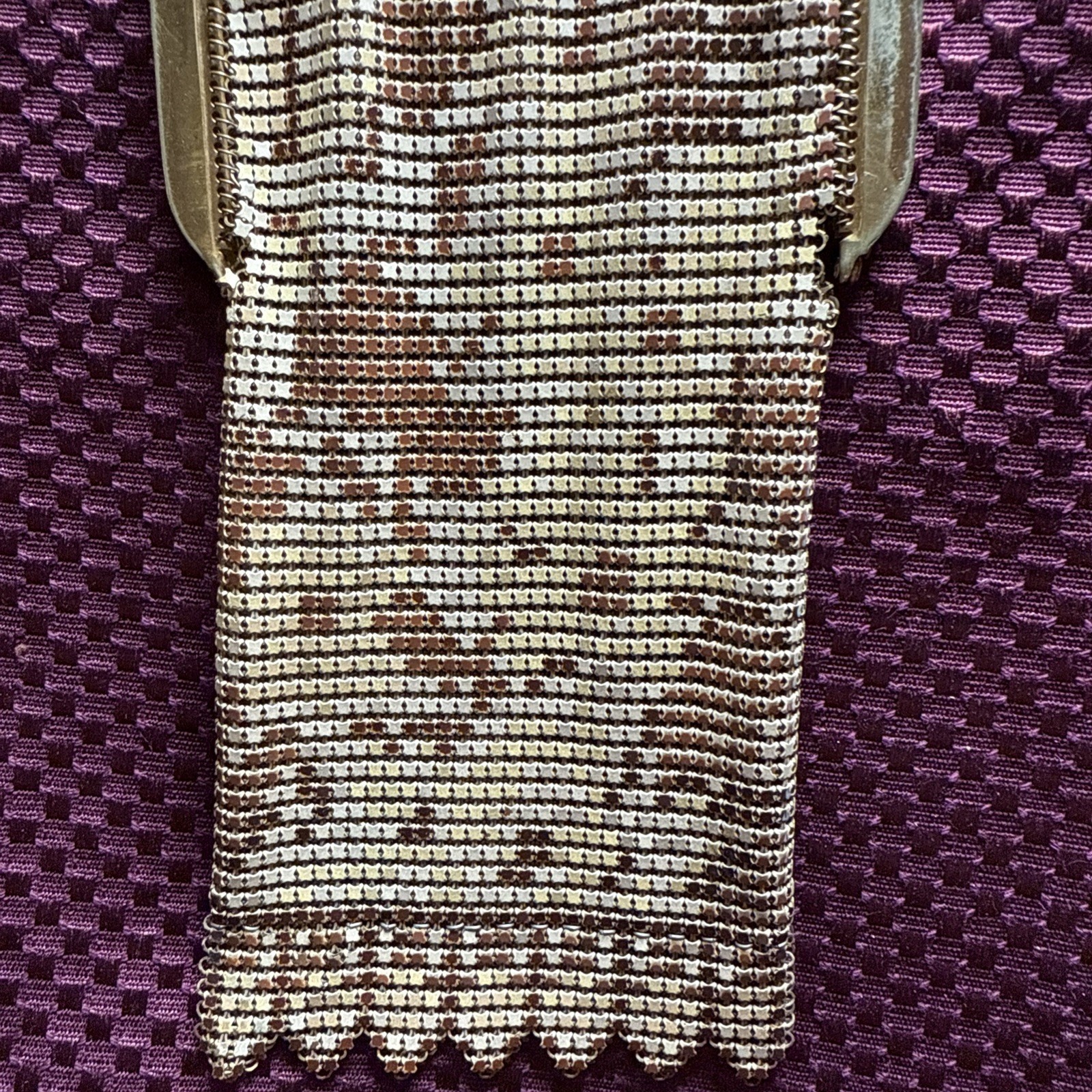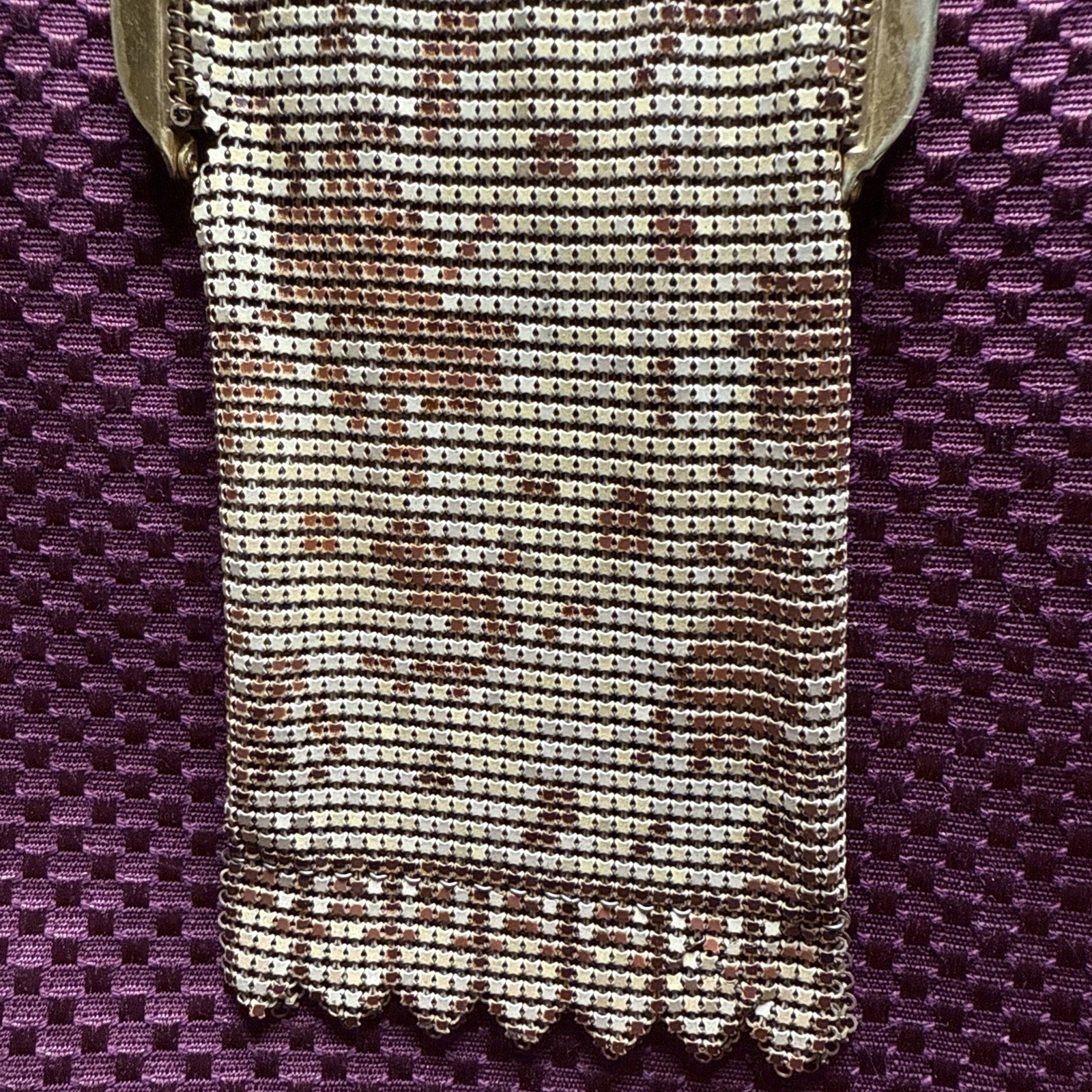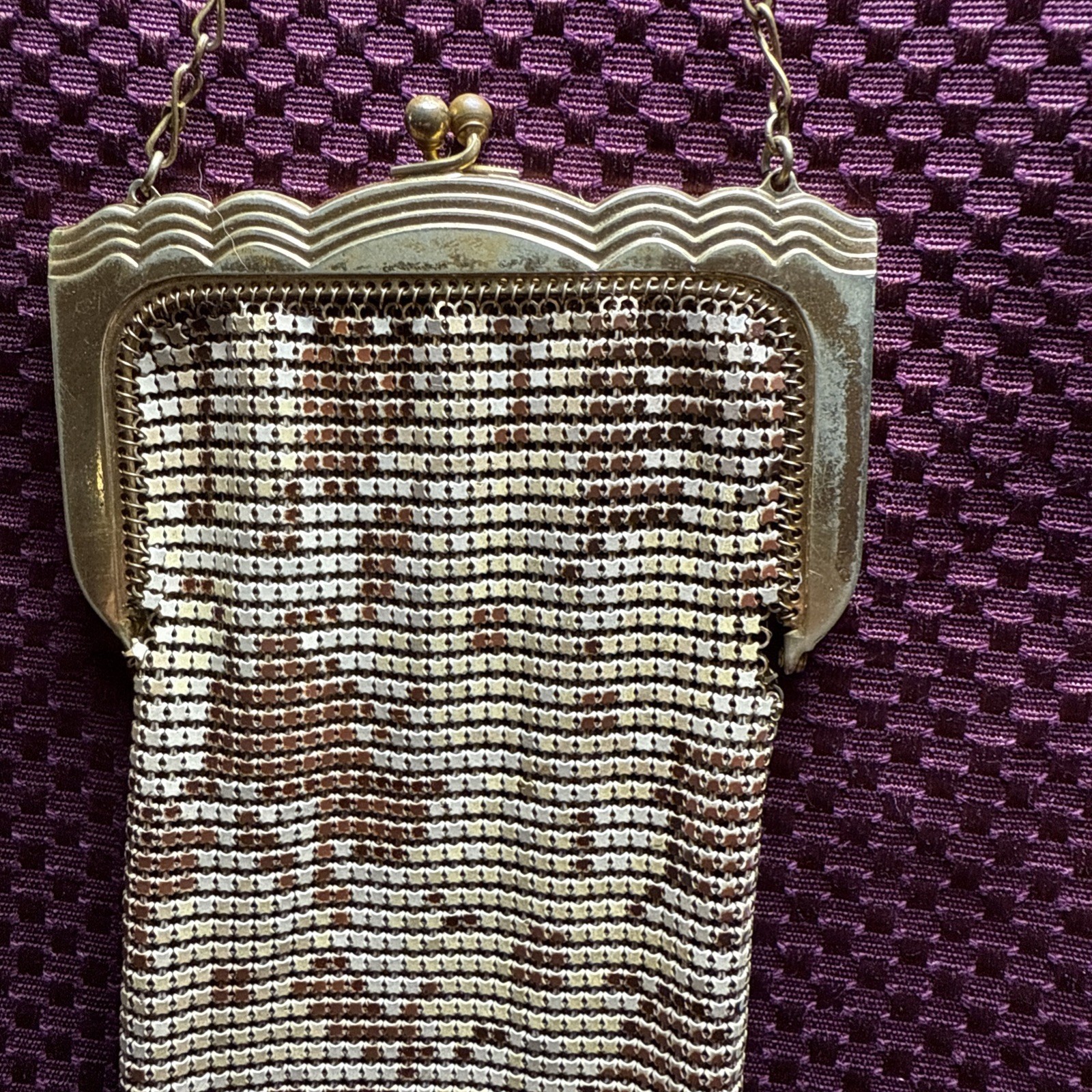 Vintage Whiting Davis Gold Flat Armor Mesh Purse With Gold Chain Strap Flapper Good condition bright and vibrant! Some tarnish See photos for measurements and determine condition This is a Whiting Davis metal mesh evening bag, a brand renowned for its innovative ?flat armor? or ring mesh construction, patented in 1909 by the Massachusetts-based company founded in 1876. The colorful bright gold tone and ornate frame with a kiss-lock clasp and chain strap align with their designs from the 1920s to 1930s, a peak period during the Art Deco era. Whiting Davis bags were celebrated for their durability and elegance, often used as formal accessories by flappers and high-society women. The scalloped edge and intricate beadwork suggest it could be from their classic line, possibly a collector?s piece if in good condition.