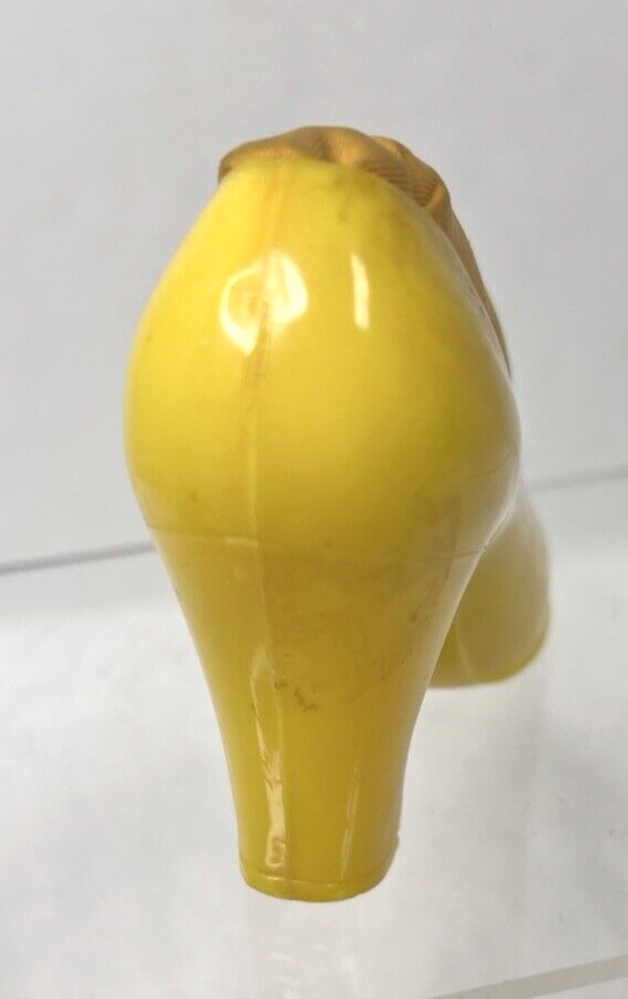 Vintage Yellow High Heeled Women?s Shoe Pincushion Yellow Hard Plastic Satin A fun vintage plastic high heeled women?s shoe bright yellow with a softer tone, yellow satin inside stand 2 3/4 by about 4 inches long possibly a little longer nice shape no chips no cracks to the plastic. The satin has been used.