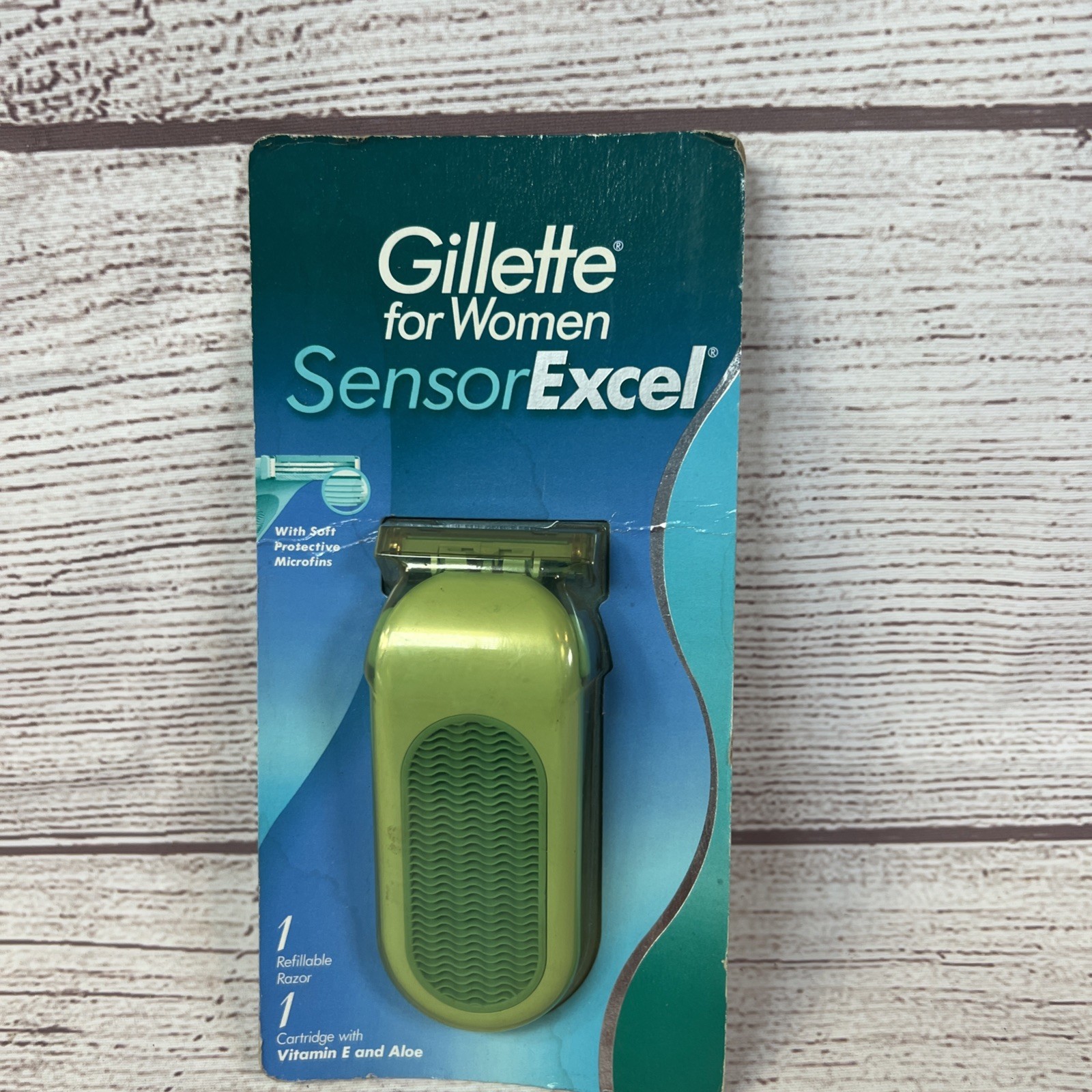 Vtg 1996 Gillette Sensor Excel for Women Green Razor Handle 1 Cartridge New. Brand New in Original Unopened Manufactured Packaging. Comes with 1 Refillable Razor and 1 Razor Cartridge with Aloe and Moisturizers. It's 4" long, 1-3/4" wide. Color is Green. Item is new in package never opened, package is a little discolored due to age.