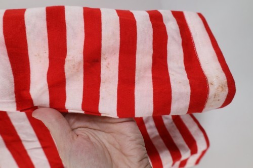 Stains, color bleed throughout. Collar discolored. Color faded. Pilling. Made in USA
