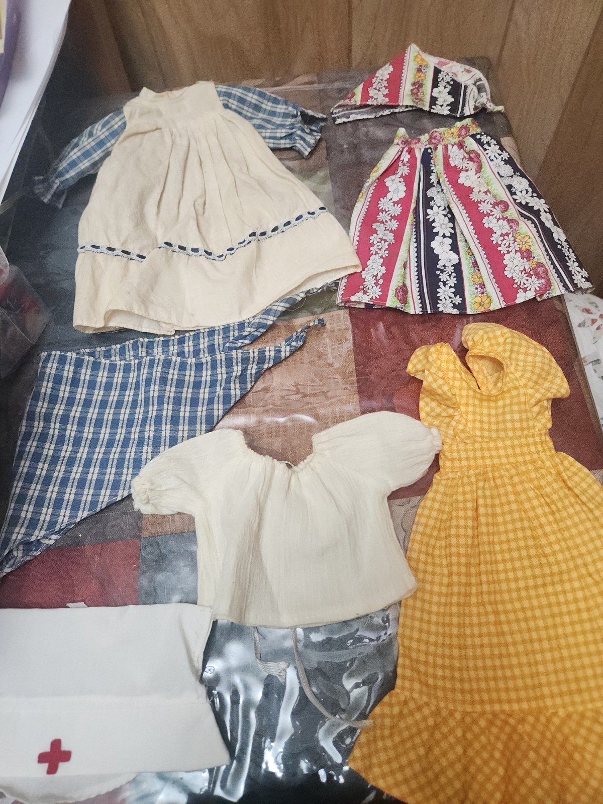 - Vtg 9 Pcs Assorted Doll Clothes Handmade. Dresses, Scarves, Cap, Blouse, Cape
