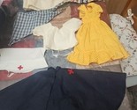 This lot includes a nurse's navy blue cape and a white cap with a red cross on it. Two dresses has the matching hair scarf. The clothing is different in size.