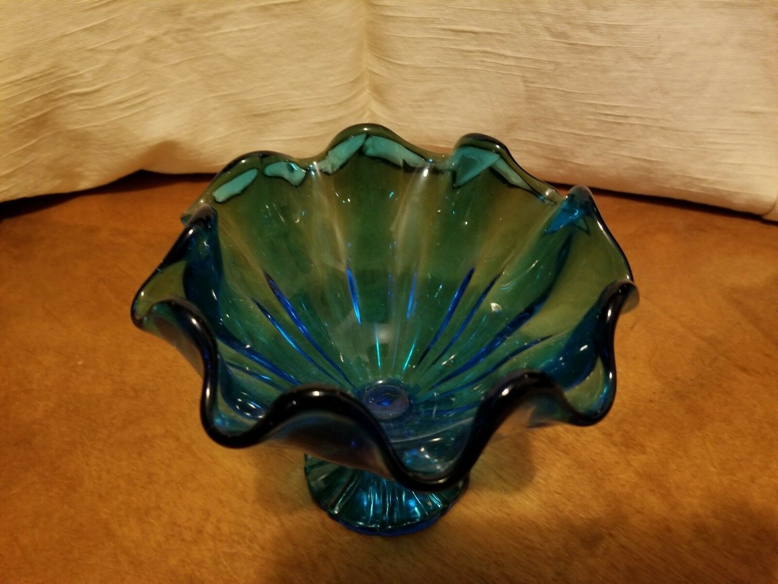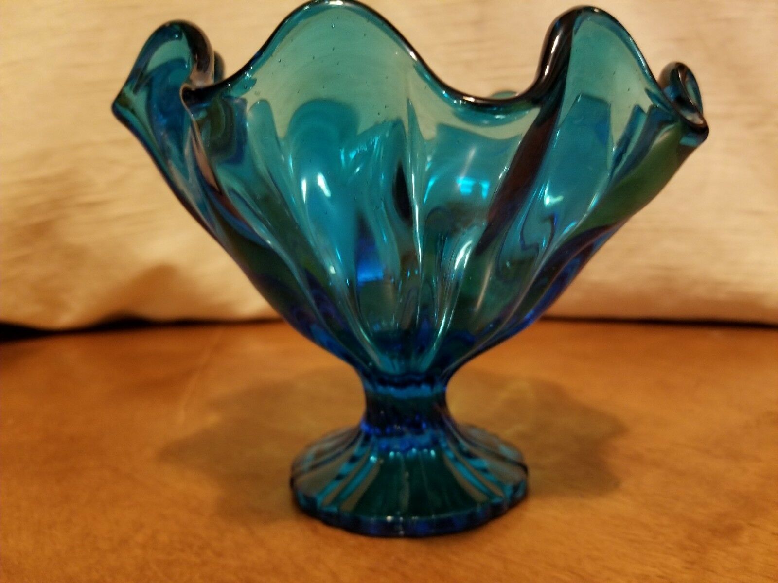 - Vtg Blue Glass Compote LE Smith Footed Pedestal Bowl Ruffle Handkerchief Scallop