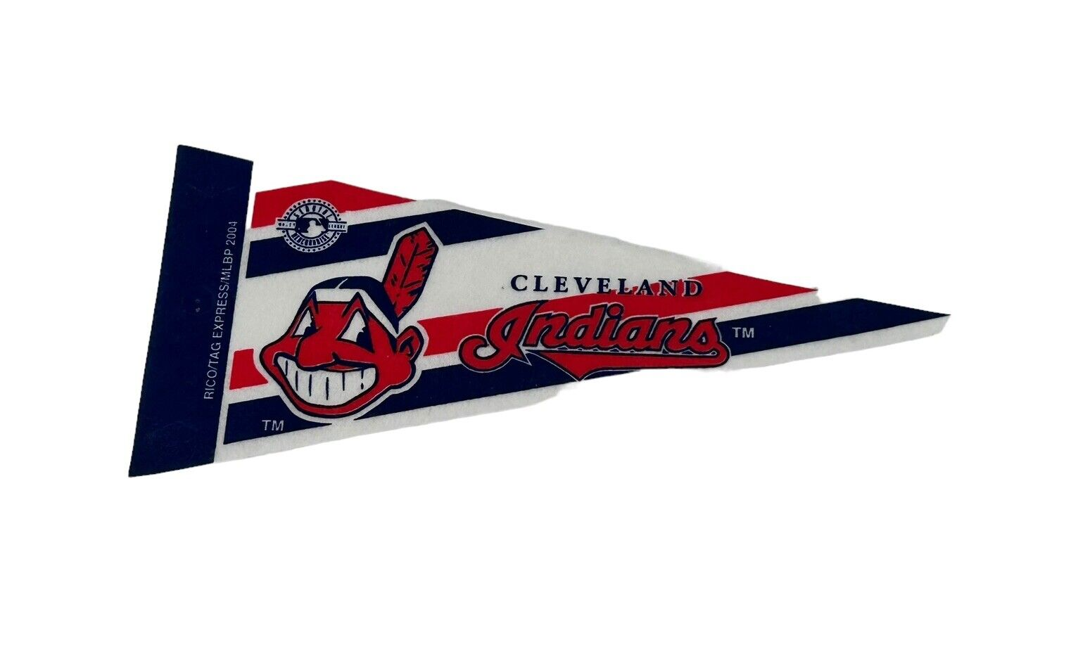Show your love for baseball with this vintage Cleveland Indians (Guardians Now) 2004 MLB mini pennant. This is the iconic one with the "Big Face" Measuring 9in x 4in, this felt banner flag is a perfect addition to any collection. The pennant features the iconic MLB logo and is officially licensed by Rico, making it a must-have for any true baseball fan.