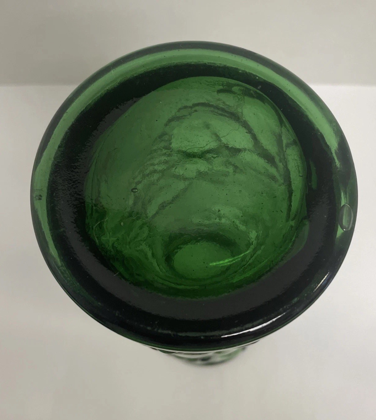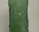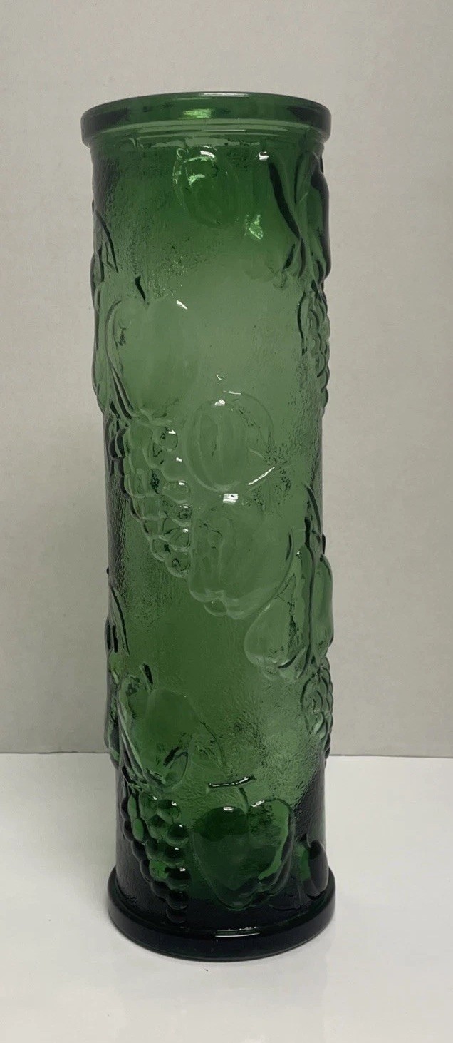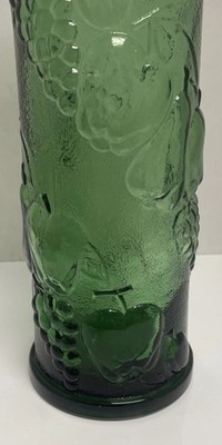 The Empoli Italian Vintage Green Glass Vase stands at 12 inches tall with a beautiful Harvest Fruit Pattern design in Emerald green. This vintage piece was crafted in Italy in the 1960s using pressed glass. The vase features intricate grape patterns, embodying an Italian theme that adds a touch of elegance to any space. Made from high-quality glass, this unmarked decanter is a unique and charming addition to any collection of decorative pottery and glassware.
