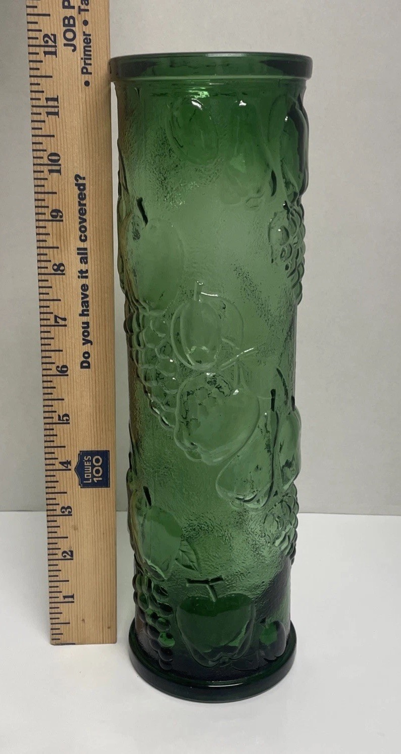 - Vtg Empoli Italian Vintage Green Glass Vase- 12” Harvest Fruit Pattern Emerald