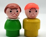 Vintage Fisher-Price Little People Two Figures: Yellow wood body plastic head smiling boy with freckles and reddish orange hat (forward-facing) All plastic brunette girl with green body Both figures are in very good condition for their age. The photos are useful for seeing condition and other details. Photos are of the actual item you will receive.