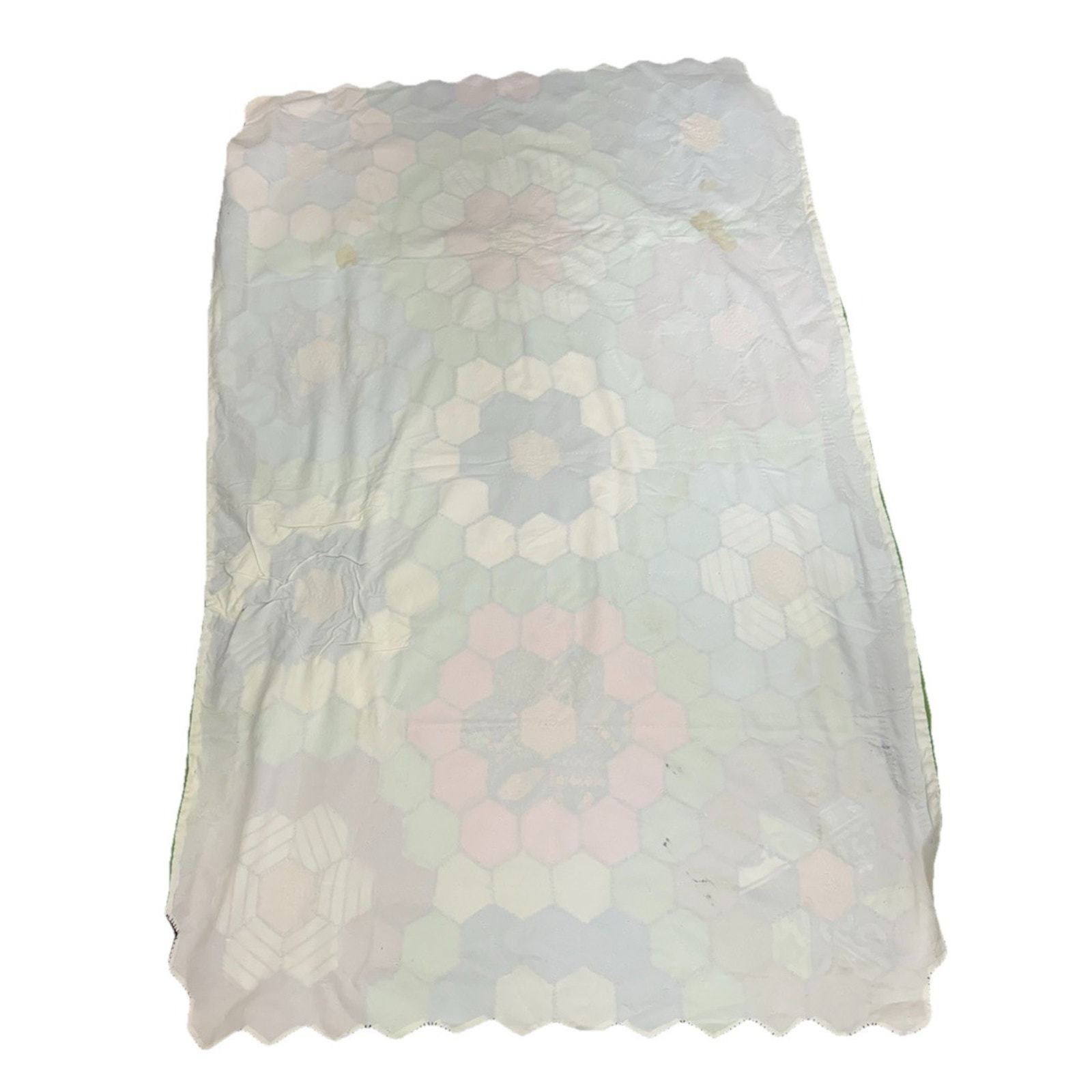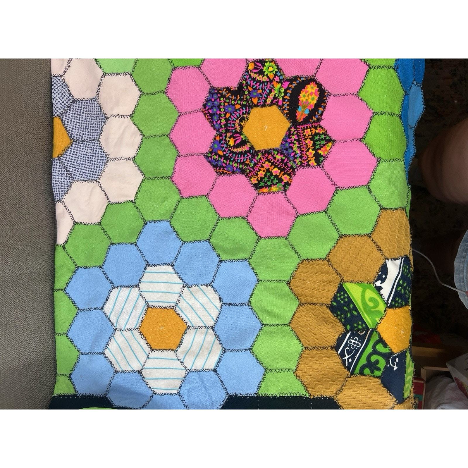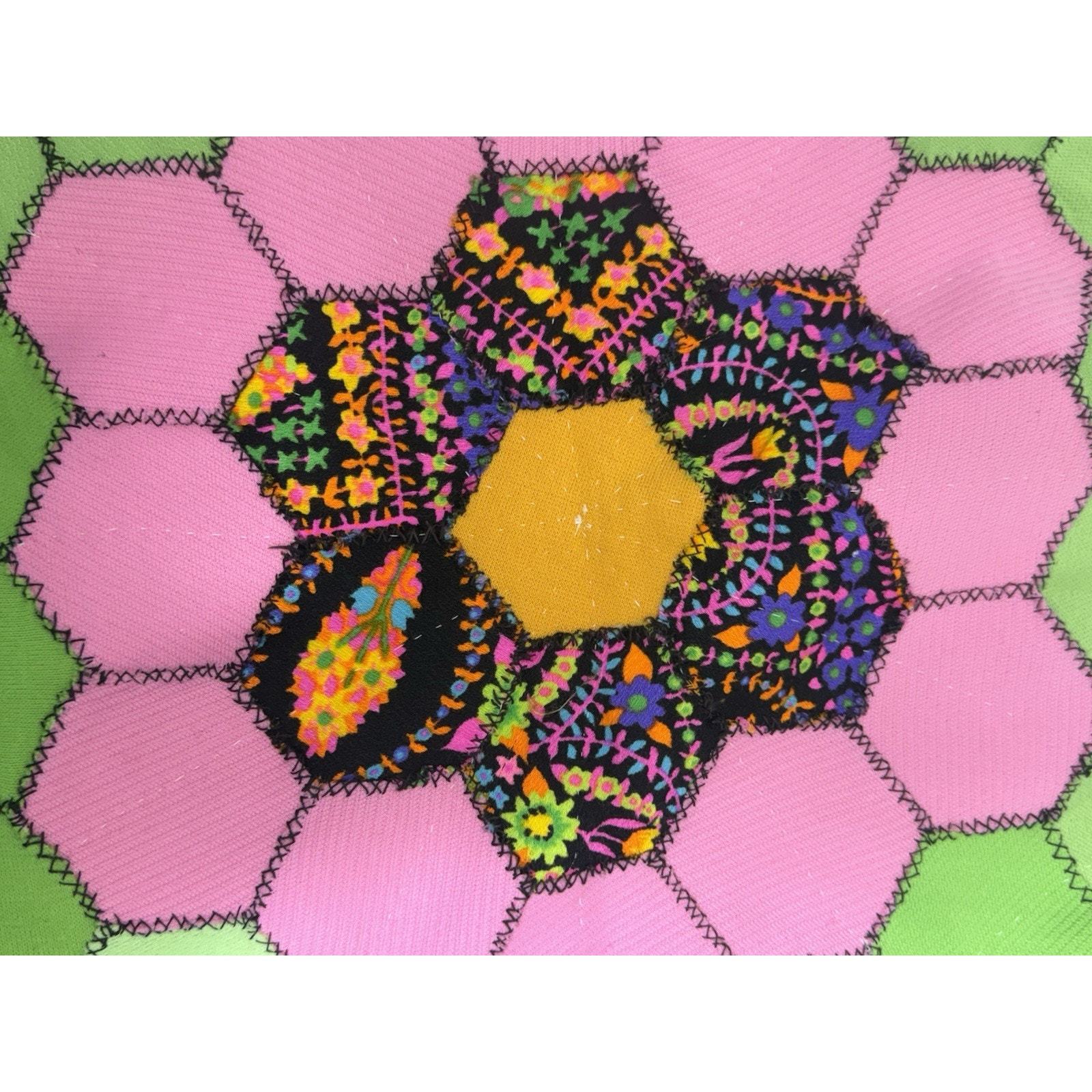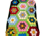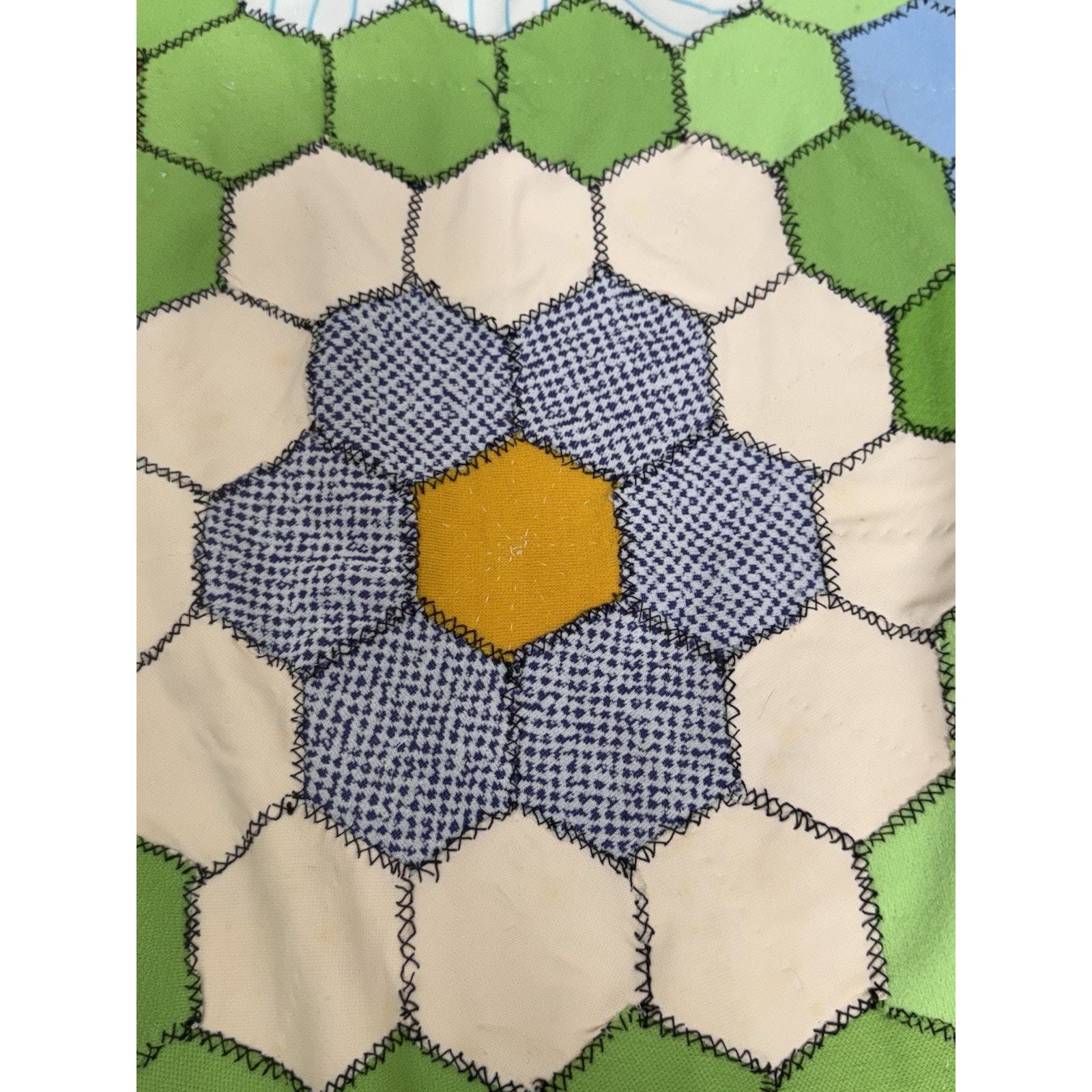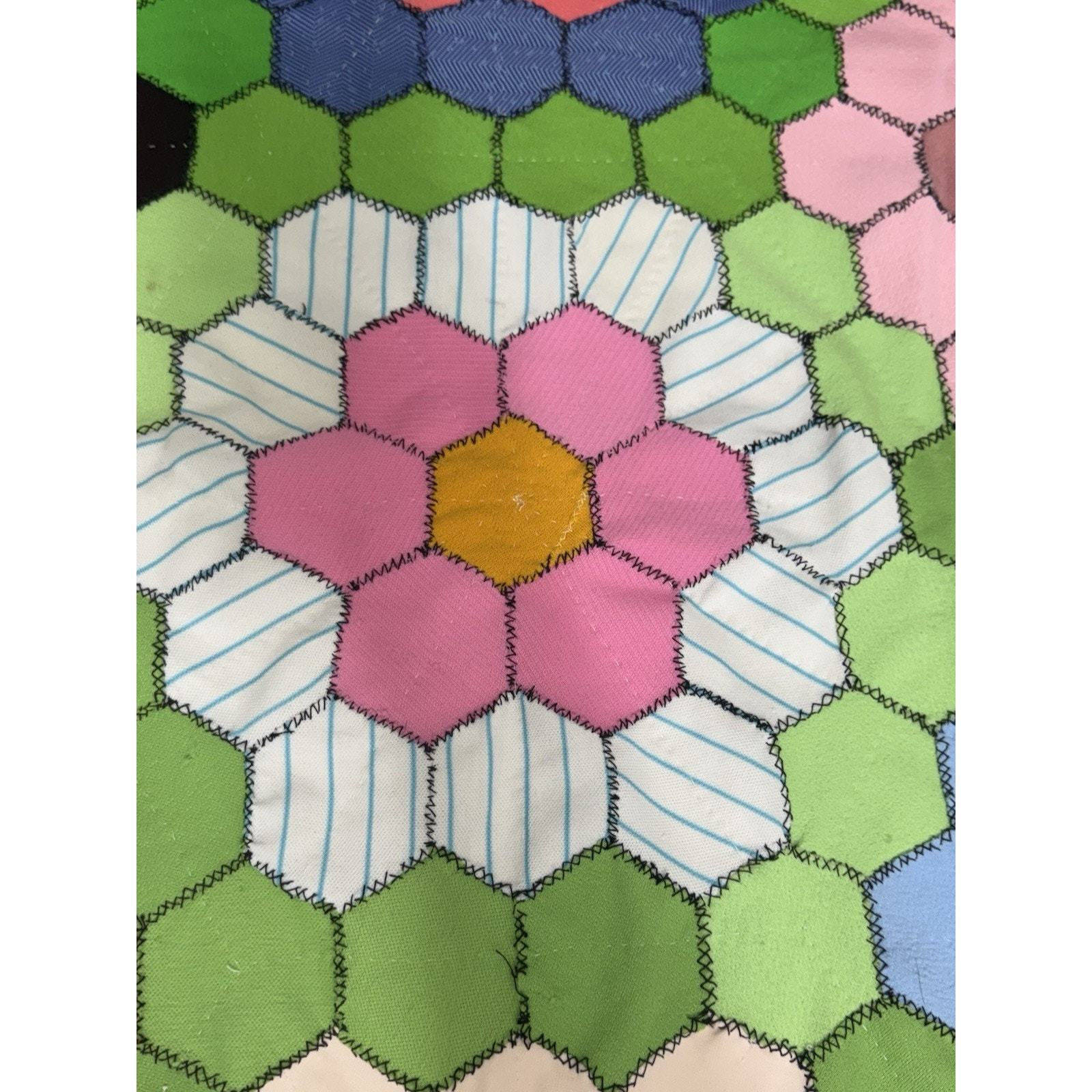 3458. Vintage Grandmother?s Flower Garden Quilt Blanket Throw Handmade Patchwork 34x50 Cottagecore This vintage Grandmother?s Flower Garden throw blanket is a handmade patchwork piece with vibrant multicolor hexagon flowers. It measures approximately 34? x 50?, making it a perfect cottagecore accent throw. Although not quilted, it follows the classic quilt pattern design, adding charm and nostalgia to your home decor. A wonderful addition for collectors or those who love vintage handmade textiles. Add this to your boho farmhouse decor or gift it to a vintage textile lover! DM me your zip and I will work on better shipping options. Please look at the pictures. Always consider offers.