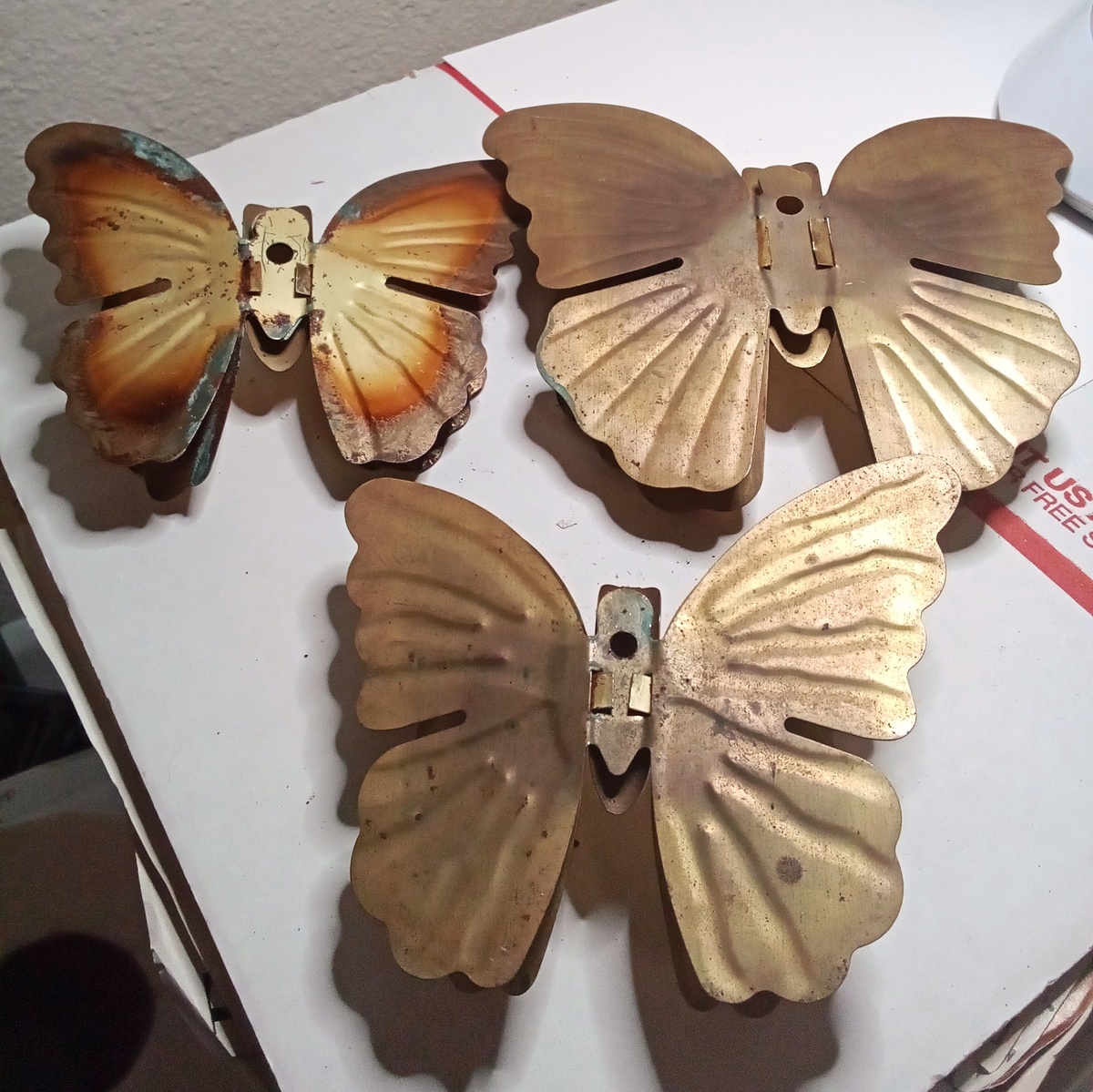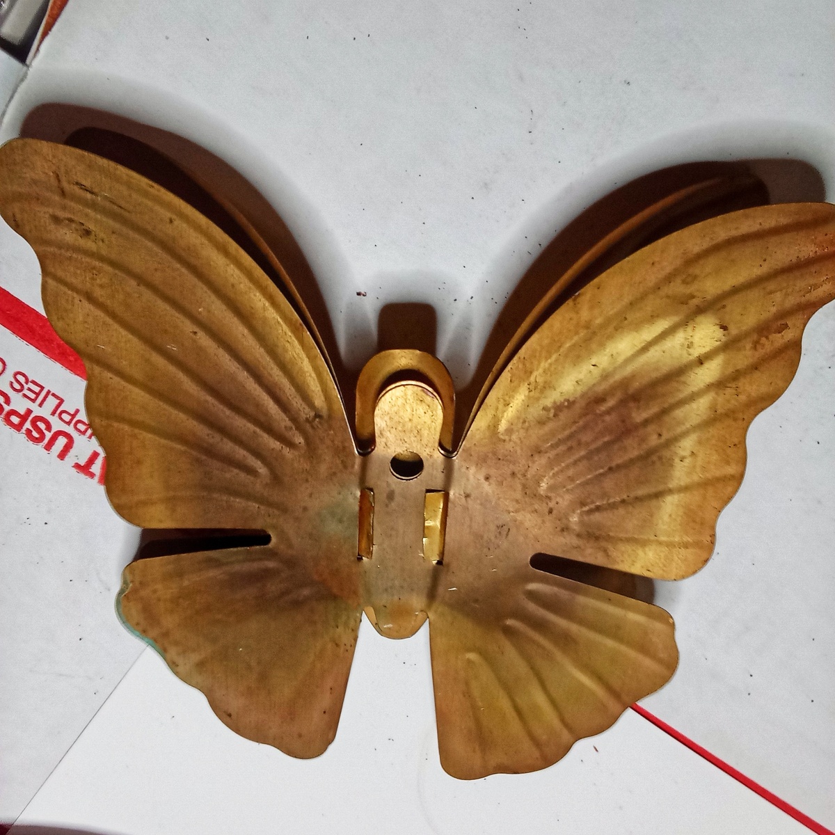 A lovely trio of vintage brass butterflies by Home Interiors/HOMCO. They made these from the mid 1970's up into the late 80's. Homco specialized inaffordable, stylish home decorsold through in home parties similar to Avon and Tupperware. From the early 1960's up until mid 80's their wall decor became hugely popular especially sets of metal wall sculptures such as these buttterflies, flowers and birds. Butterflies were among the best selling items reflecting mid century fascination with nature themes and gold toned metallic finishes. Each of these pieces feature a rich gold and bronze tone with sculpted wing details and a natural vintage patina. They are authentic Home Interiors wall decor made here in USA. The set of 3 is ready to hang with only light vintage wear consistent with their age. Three different sizes 5.75" wide, 4.75" wide and 3.75" inches wide. These are a perfect accent for mid century, boho or retro home decor their lightweight design will add instant vintage charm to any wall display.