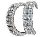 These gorgeous vintage hoop earrings feature a statement double row of prong-set crystals measuring 1.4 inches in diameter. They are in great condition, with slight tarnishing that suggests they may be sterling silver or plated, although there are no visible markings. The earrings are approximately 3/8 inches wide and are adorned with a double row of sparkling crystals. Based on the lack of an open back, it is unlikely that they are cubic zirconia. These earrings undoubtedly make a bold fashion statement.