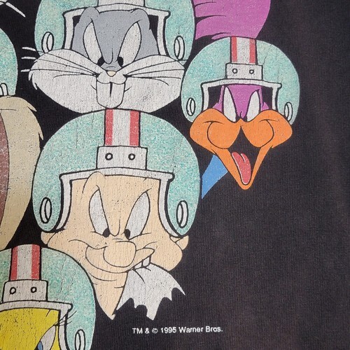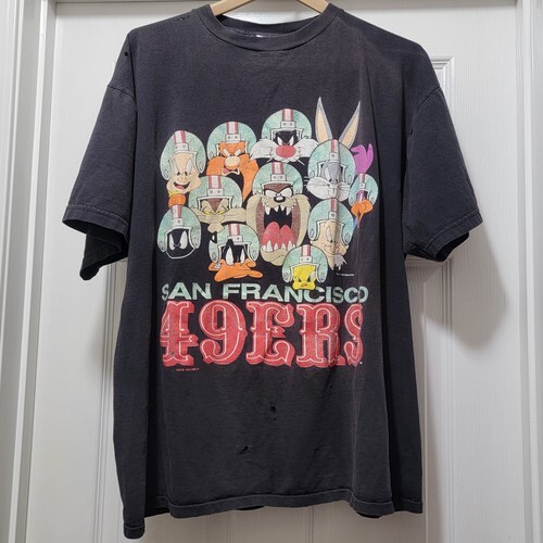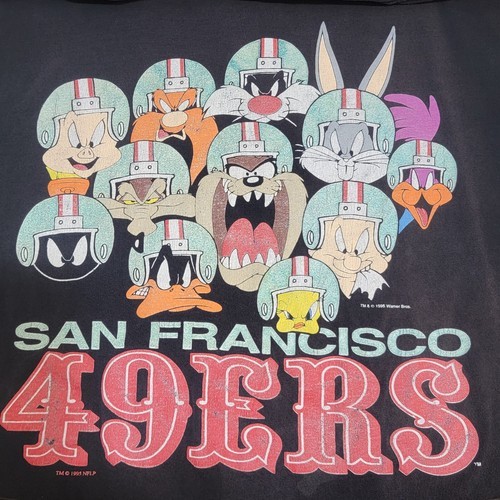 Rare Vintage Original 1995 Looney Tunes Gang Warner Bros and 49ERS NFLP Black Football Single Stitch Shirt Men's Size XL. Actual measurements: 48" chest, 28" length. United Brands International. THIS IS NOT A REPO!