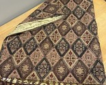 This vintage Pier 1 bed throw features a diamond pattern in a multicolor tapestry design, accented with beaded detailing and fringed edges for a boho aesthetic. Measuring 60 inches in length and 50 inches in width, this throw blanket is adorned with gold lining for an added touch of luxury. Perfect for adding a touch of warmth and style to any room, this unique piece exudes a charming and eclectic vibe that is sure to elevate your home decor.