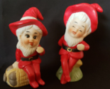 Vintage 1960's Red Ceramic Christmas Pixie Elves Figurine Set Ucagco, Taiwan Tallest is about 4" and sitting on a toadstool Smaller is about 3 3/4" tall and sitting on a basket with a silly expression Very good condition